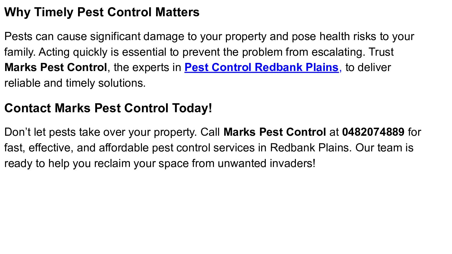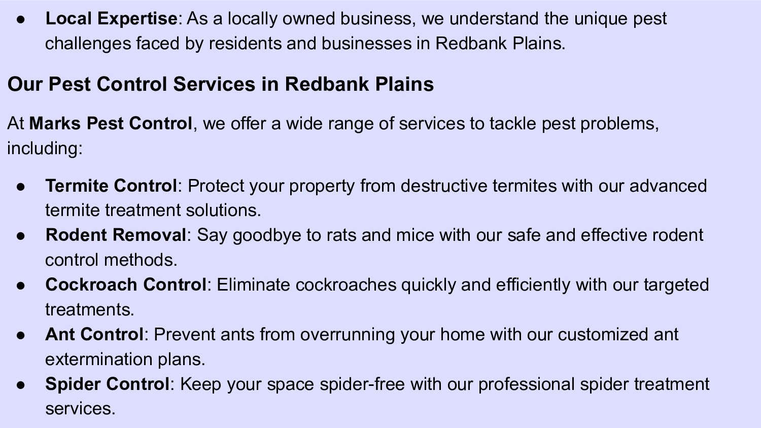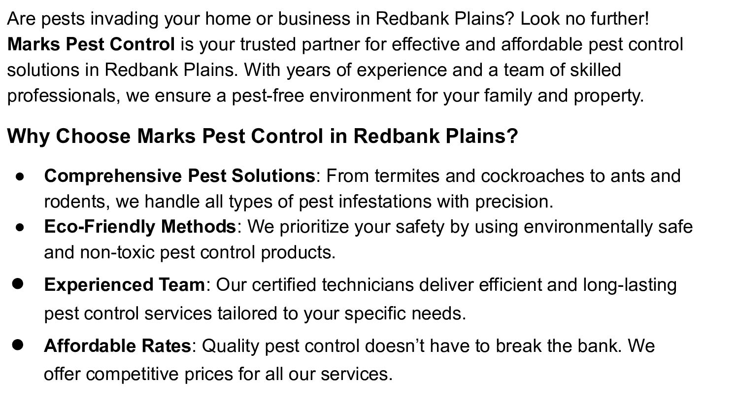 Are pests invading your home or business in Redbank Plains? Look no further! Marks Pest Control is your trusted partner for effective and affordable pest control solutions in Redbank Plains. With years of experience and a team of skilled professionals, we ensure a pest-free environment for your family and property.