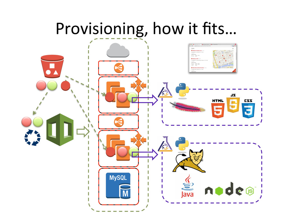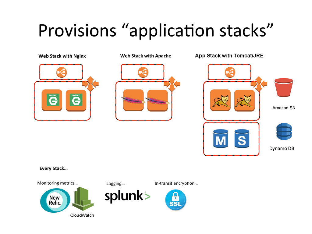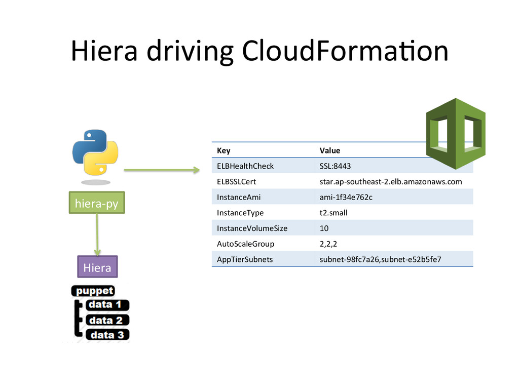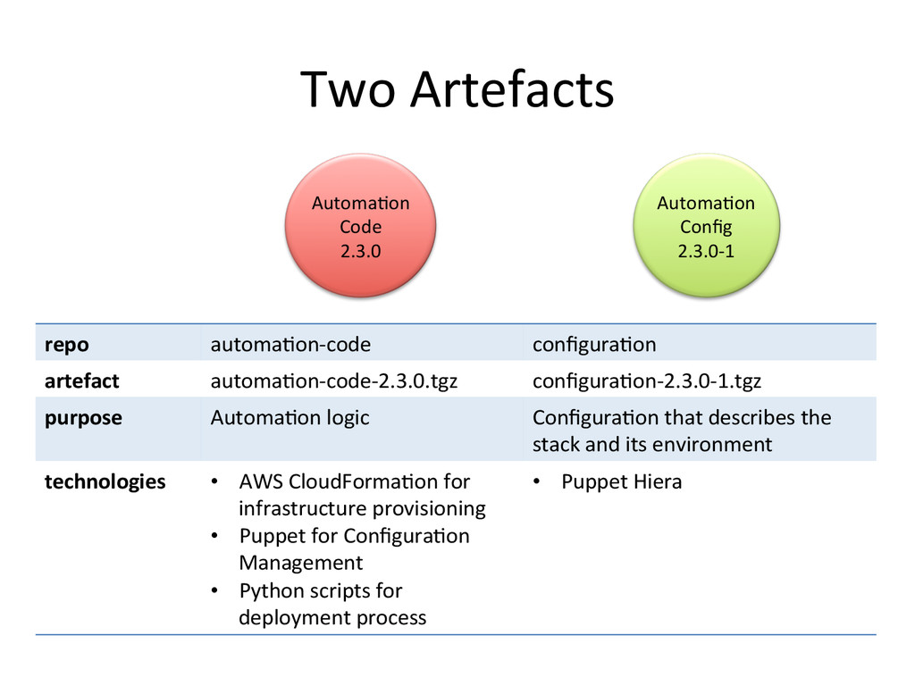 automa.on-‐code-‐2.3.0.tgz configura.on-‐2.3.0-‐1.tgz purpose Automa.on logic Configura.on that describes the stack and its environment technologies • AWS CloudForma.on for infrastructure provisioning • Puppet for Configura.on Management • Python scripts for deployment process • Puppet Hiera Automa.on Code 2.3.0 Automa.on Config 2.3.0-‐1