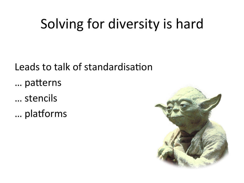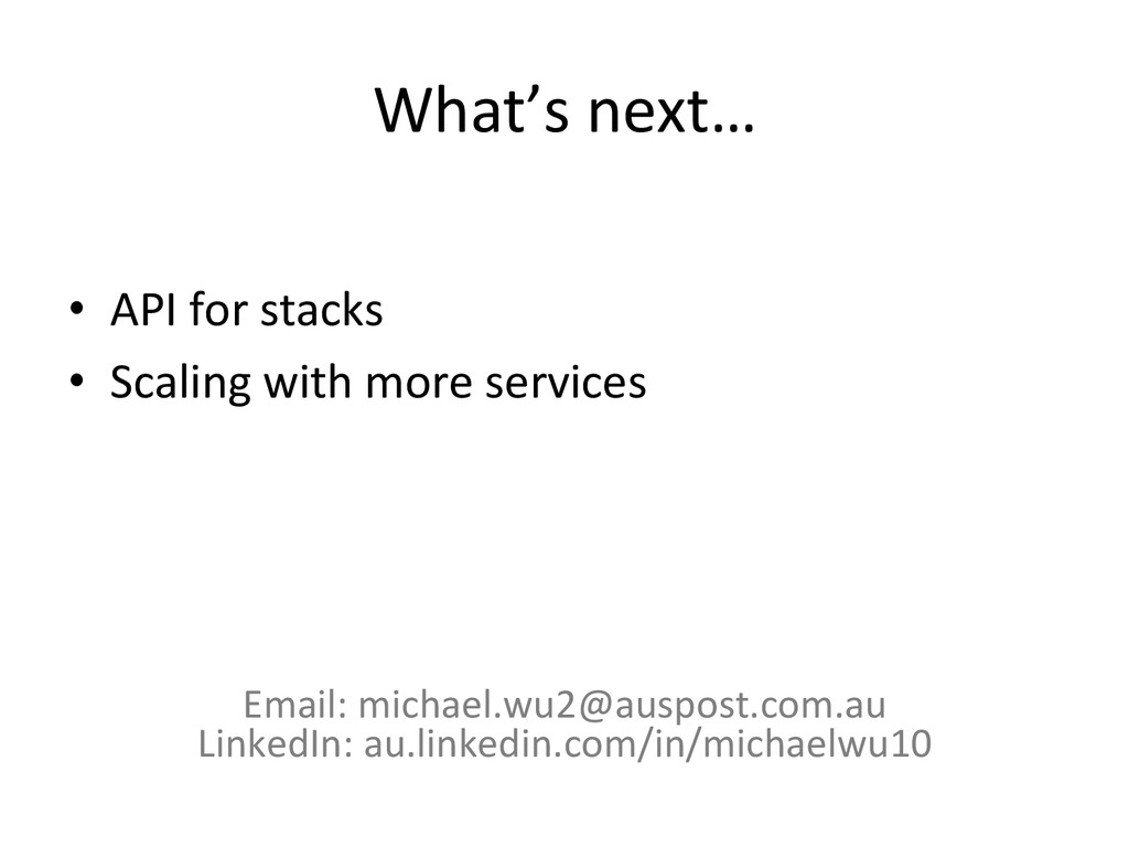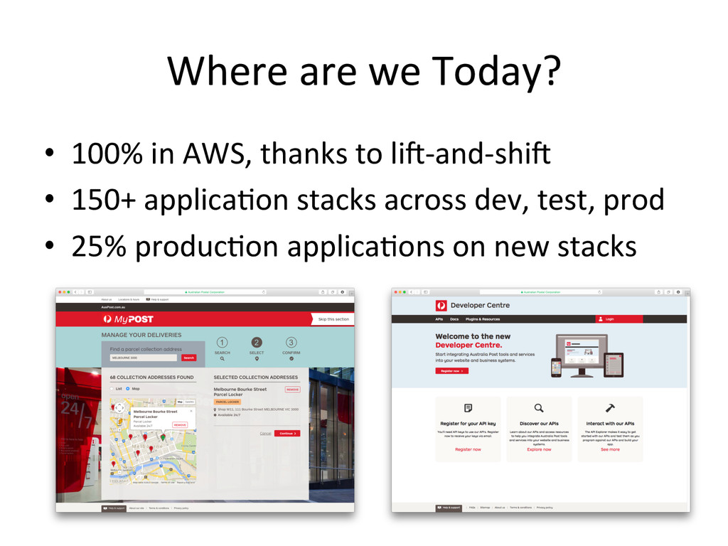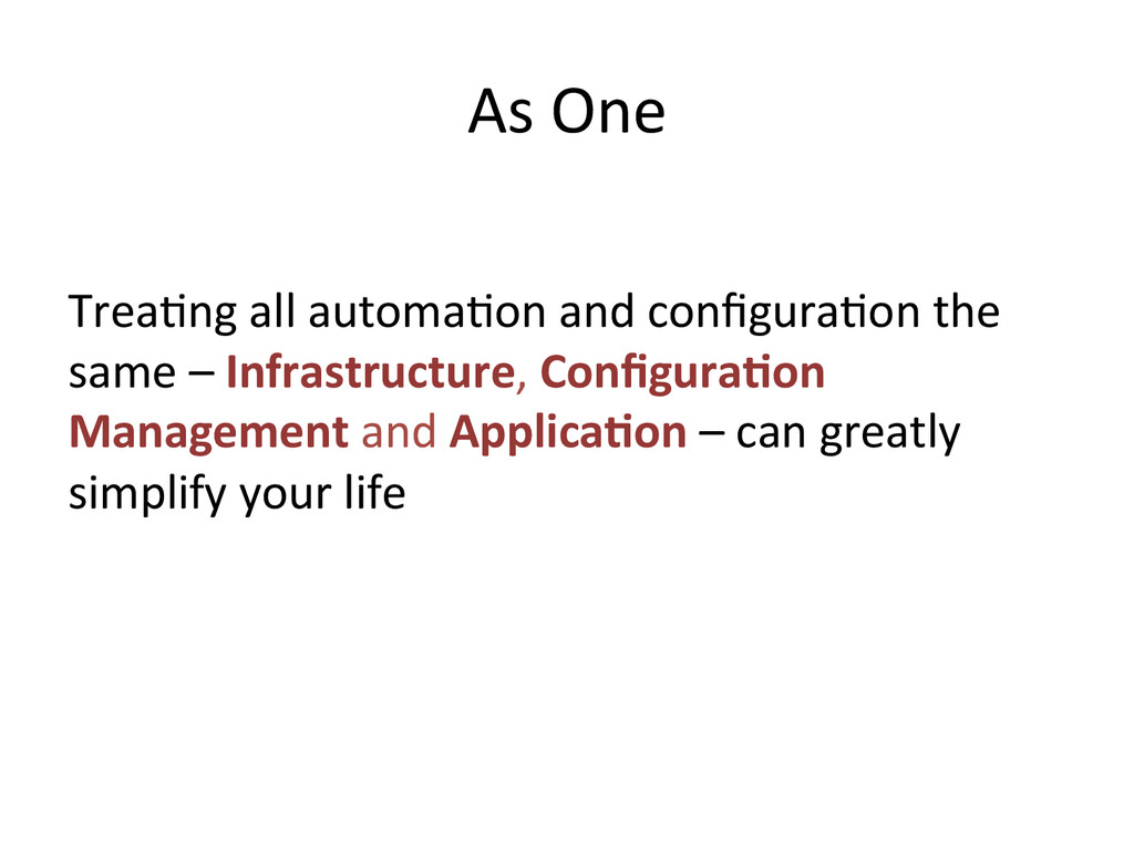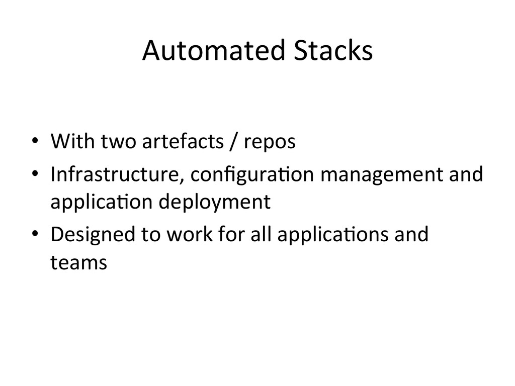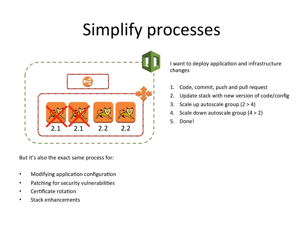 changes 1. Code, commit, push and pull request 2. Update stack with new version of code/config 3. Scale up autoscale group (2 > 4) 4. Scale down autoscale group (4 > 2) 5. Done! 2.1 2.1 2.2 2.2 But it’s also the exact same process for: • Modifying applica.on configura.on • Patching for security vulnerabili.es • Cer.ficate rota.on • Stack enhancements