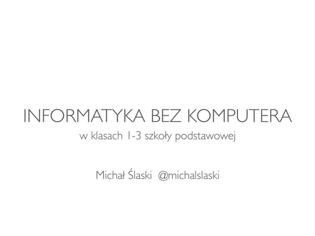 Prezentacja z konferencji "Informatyka w szkole. Z komputerem i bez komputera", która odbyła się w budynku Wydziału Matematyki i Informatyki Uniwersytetu im. Adama Mickiewicza w Poznaniu. Tematem konferencji była metodyka nauczania informatyki w szkole na różnych poziomach edukacyjnych. W mojej prezentacji opsiałem doświadczenie prowadzenia zajęć z infromatyki bez komputera dla klas 1-3 szkoły podstawoej.