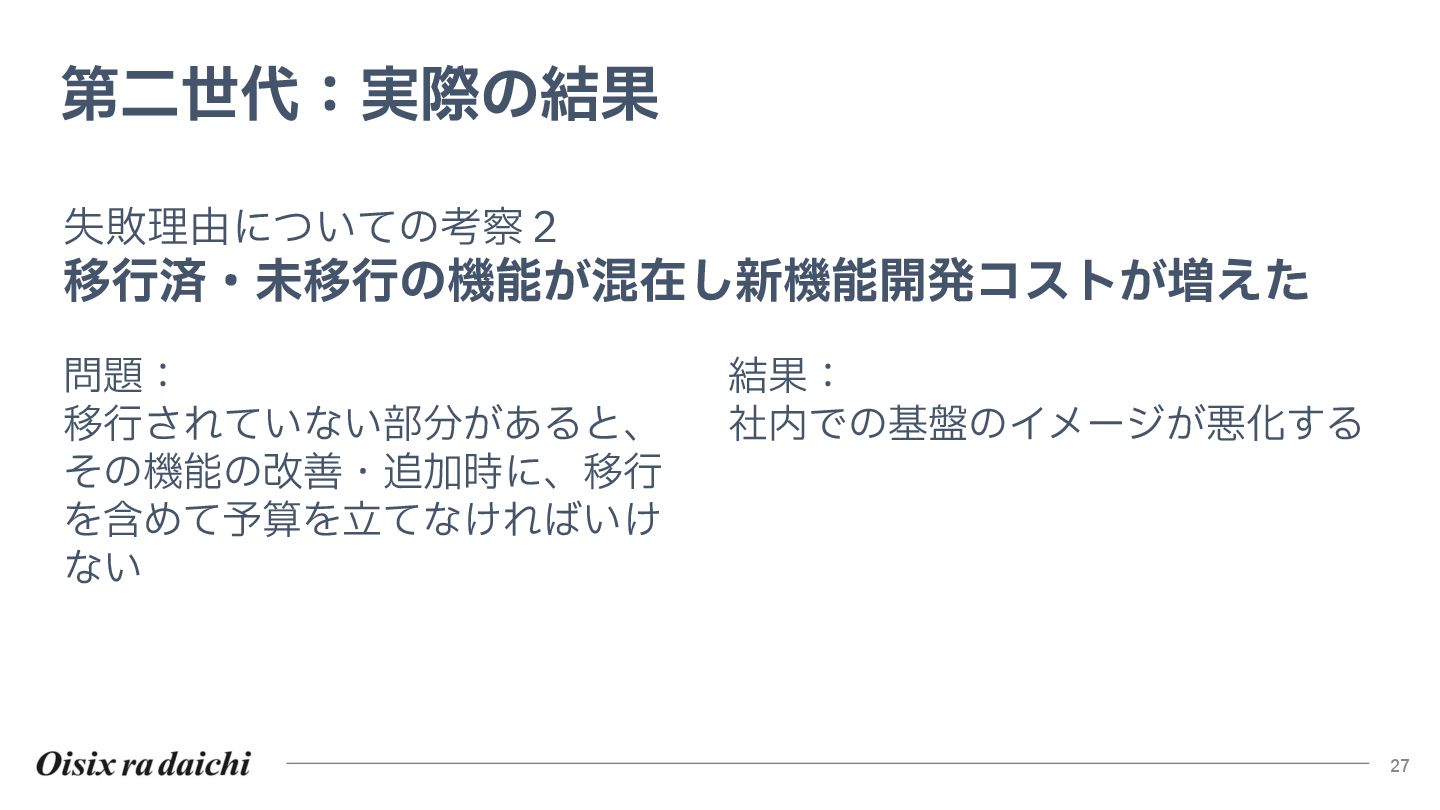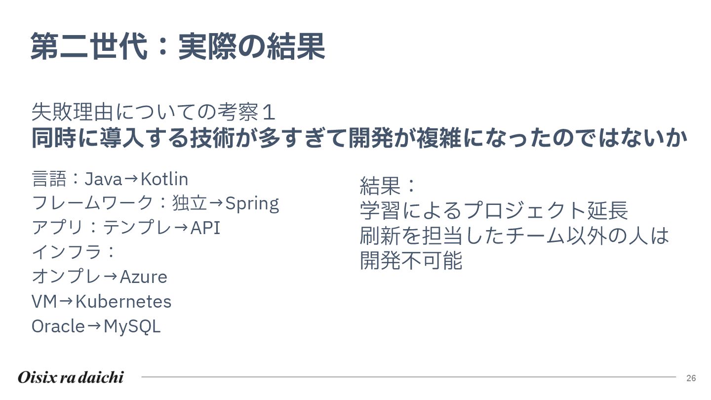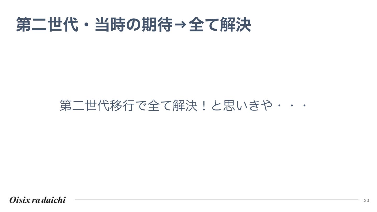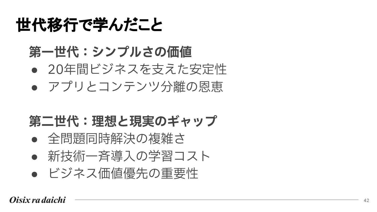 Oisixを25年以上支えたシステムは巨大な技術的負債となりました。2018年開始の第二世代刷新は、守りを重視した結果停滞し、理想と現実のギャップを痛感。この失敗から「負債解消は短期決戦」と学び、アプローチを180度転換しました。