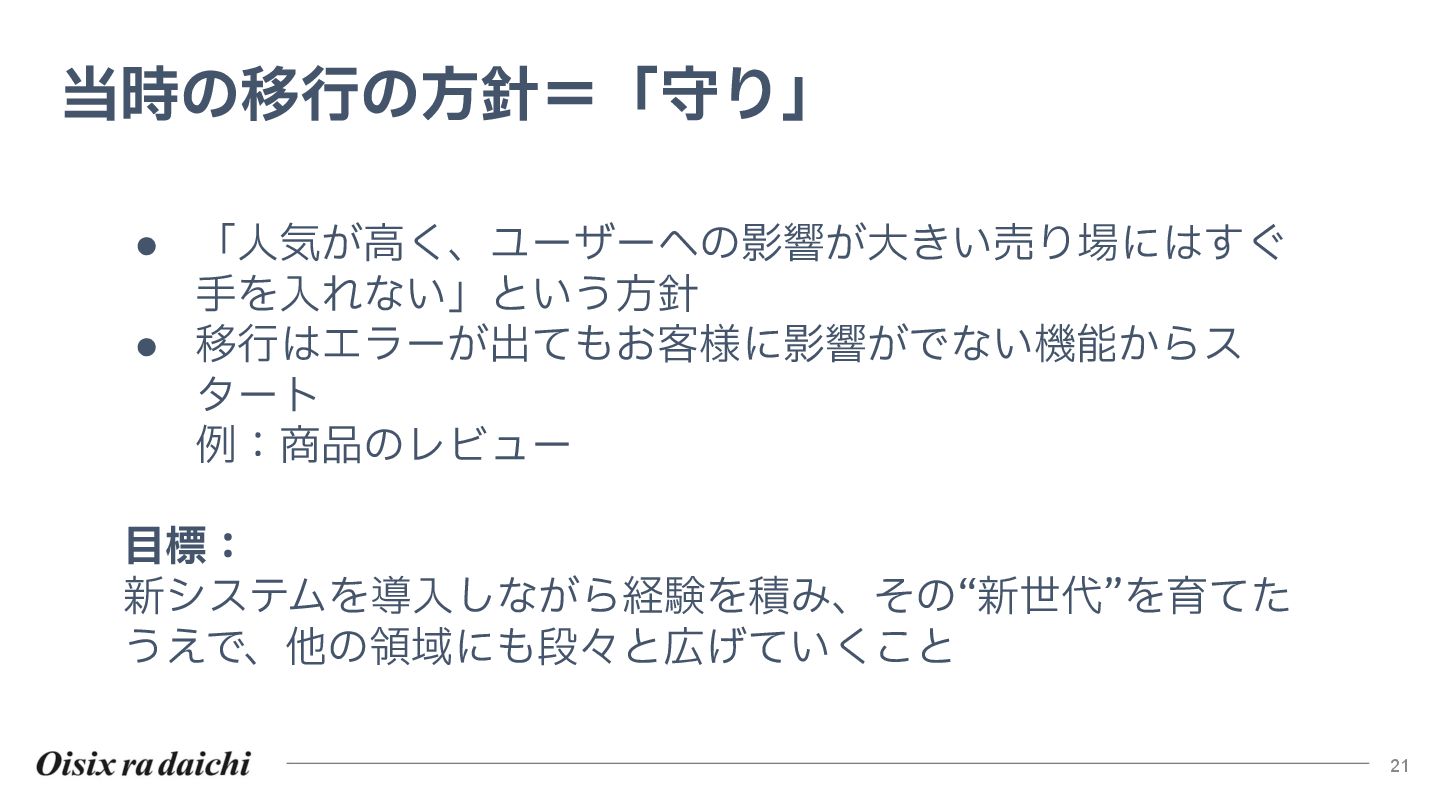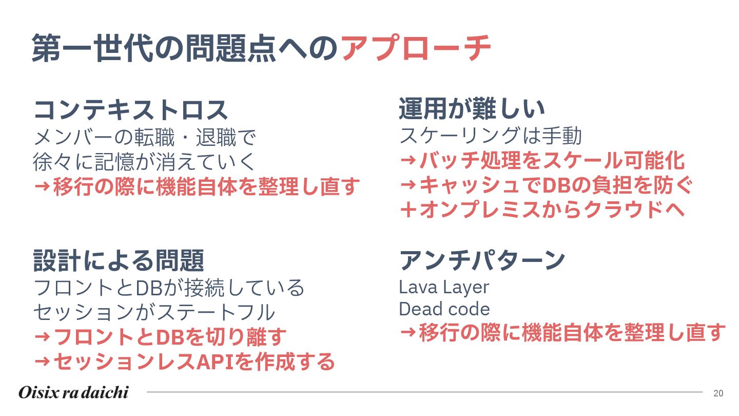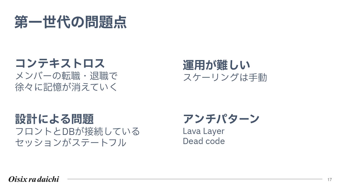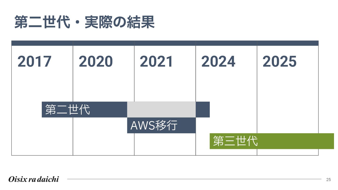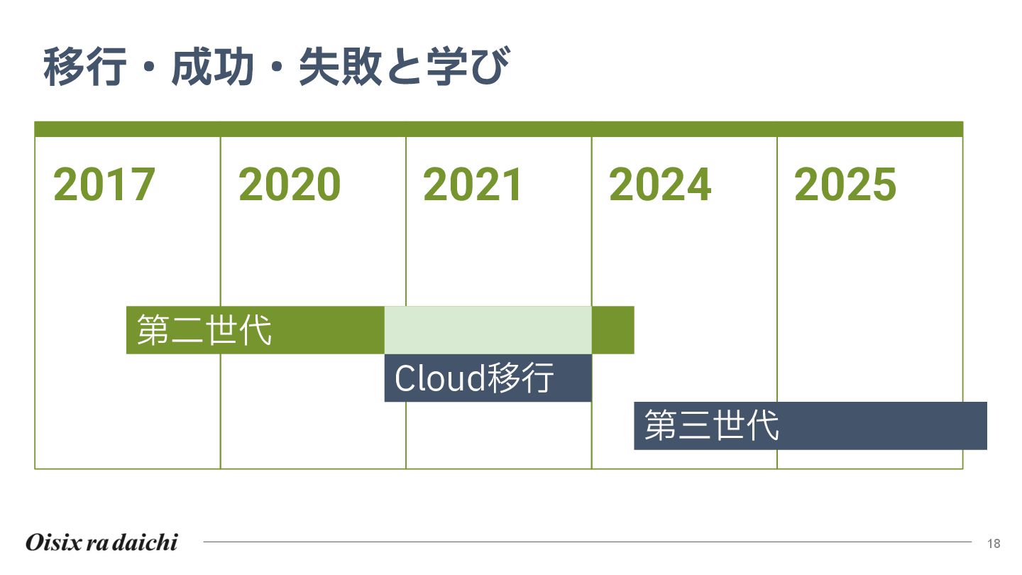 Oisixを25年以上支えたシステムは巨大な技術的負債となりました。2018年開始の第二世代刷新は、守りを重視した結果停滞し、理想と現実のギャップを痛感。この失敗から「負債解消は短期決戦」と学び、アプローチを180度転換しました。