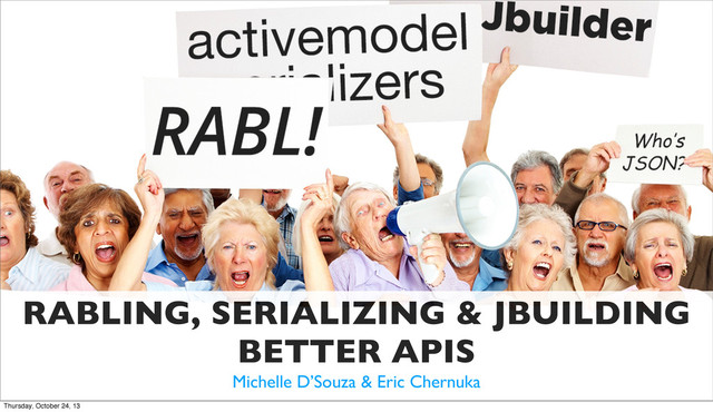 When building JSON APIs for mobile apps, we find ourselves wanting a more expressive and powerful solution. This is especially true when the JSON representation is complex or doesn't match the exact schema defined within the database. In this presentation, we demo not One, not Two but Three different ways of generating APIs in rails: RABL, Active Model Serializers and JBuilder, and highlight what we've learnt from each one of them.