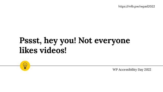 accessible for the blind and visually imparied (MP4) ◉ Most of the time Vimeo and YouTube does this automatically ◉ WordPress makes it easy to embed videos ◉ Products like Adobe Premiere Pro can help 19 https://mlb.pw/wpad2022