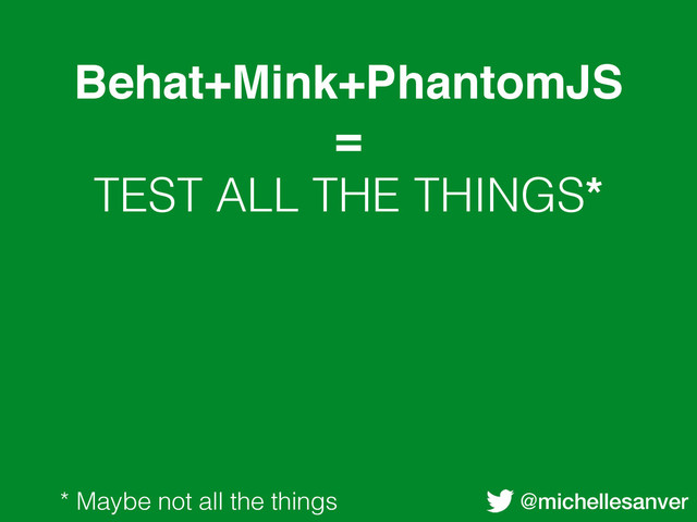 Sometimes simple unit testing is not enough. There is more to it than that when you want to test JavaScript and the rendering of your page. In this talk I will show you how you can use Behat+Mink+PhantomJS to accomplish screenshot comparison, test your JavaScript implementations and your PHP code using the same human-readable language: Behat’s Gherkin.