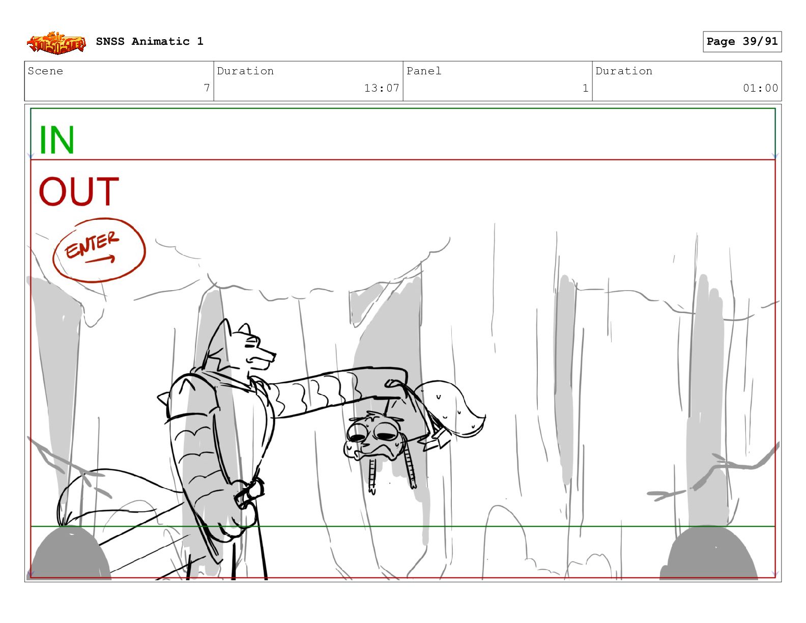 Scene 13 Duration 07:22 Panel 1 Duration 01:00 SNSS Animatic