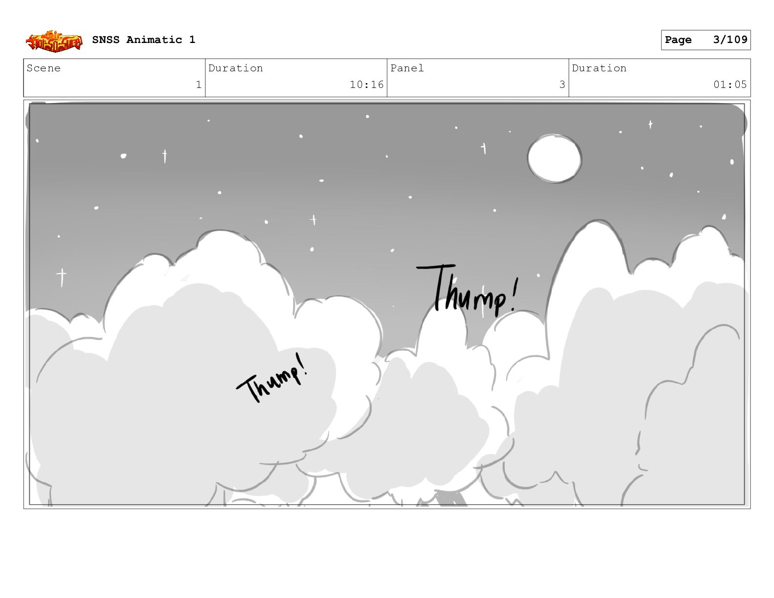 Scene 1 Duration 10:16 Panel 3 Duration 01:05 SNSS Animatic