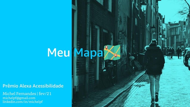 Pitch para apresentação no evento final do Prêmio Alexa de Acessibilidade, iniciado em 2020 da qual contou com mais de 100 skills submetidas das quais apenas 10 foram a final. A skill Meu Mapa foi uma das finalistas no evento.