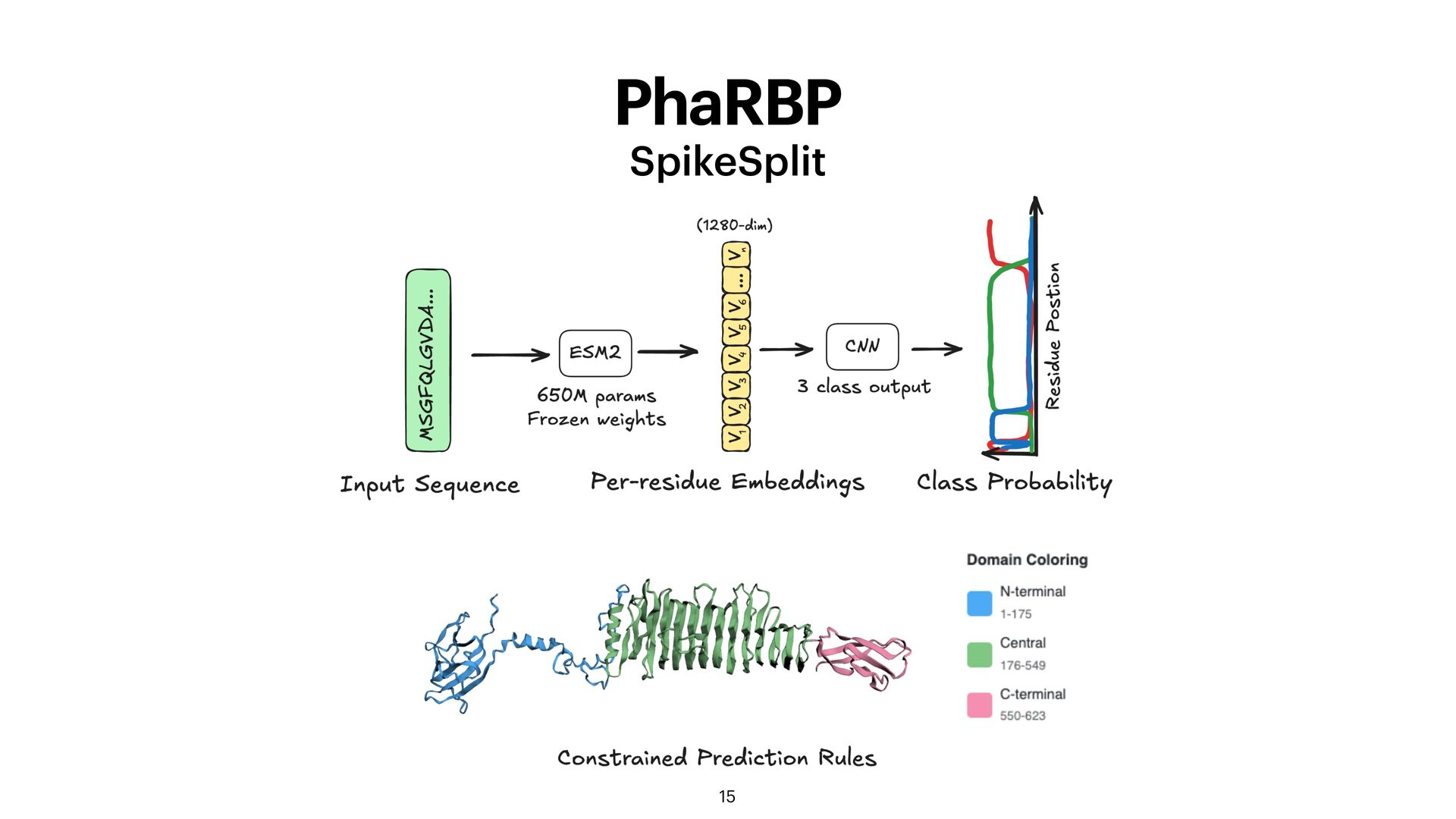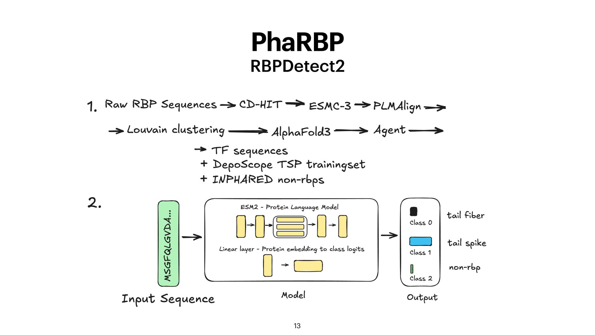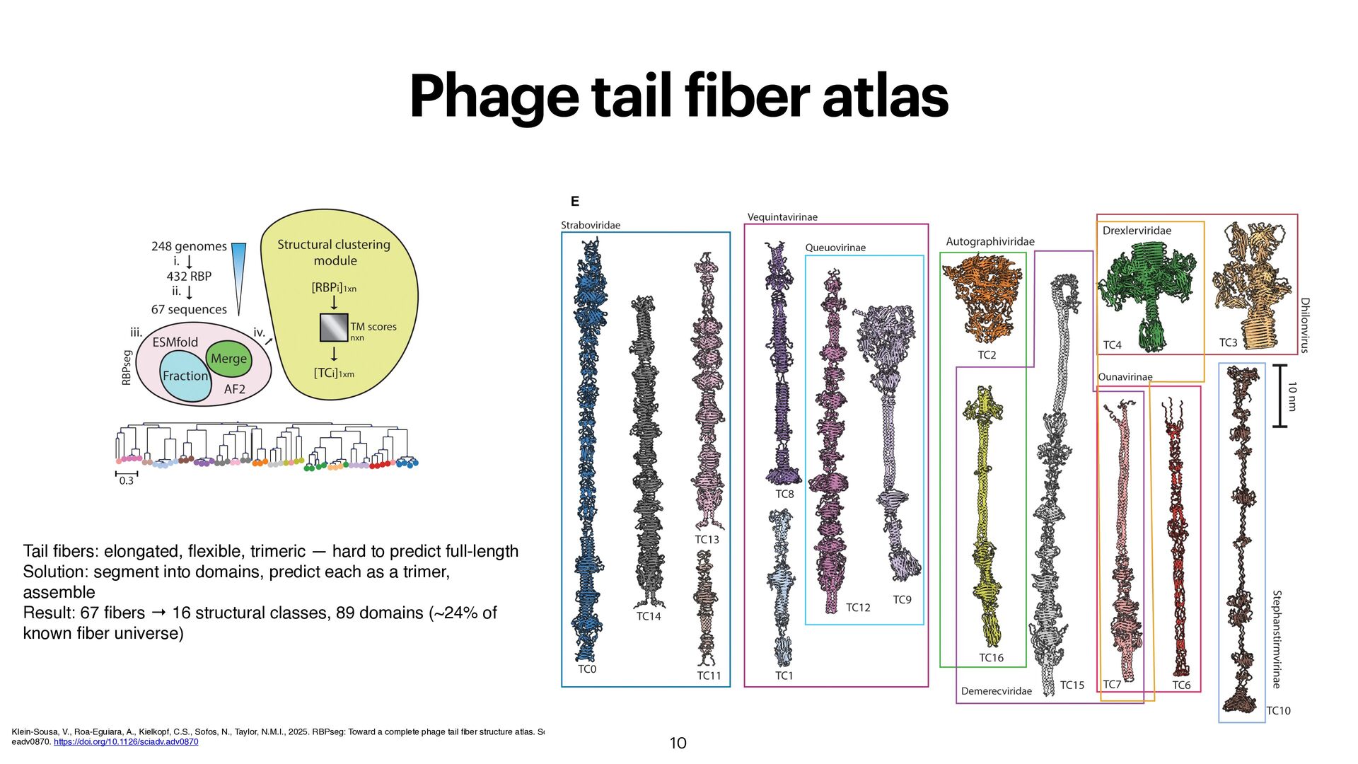 Kielkopf, C.S., Sofos, N., Taylor, N.M.I., 2025. RBPseg: Toward a complete phage tail fi ber structure atlas. Sci Adv 11, eadv0870. https://doi.org/10.1126/sciadv.adv0870 Tail fi bers: elongated, fl exible, trimeric — hard to predict full-length Solution: segment into domains, predict each as a trimer, assemble Result: 67 fi bers → 16 structural classes, 89 domains (~24% of known fi ber universe)