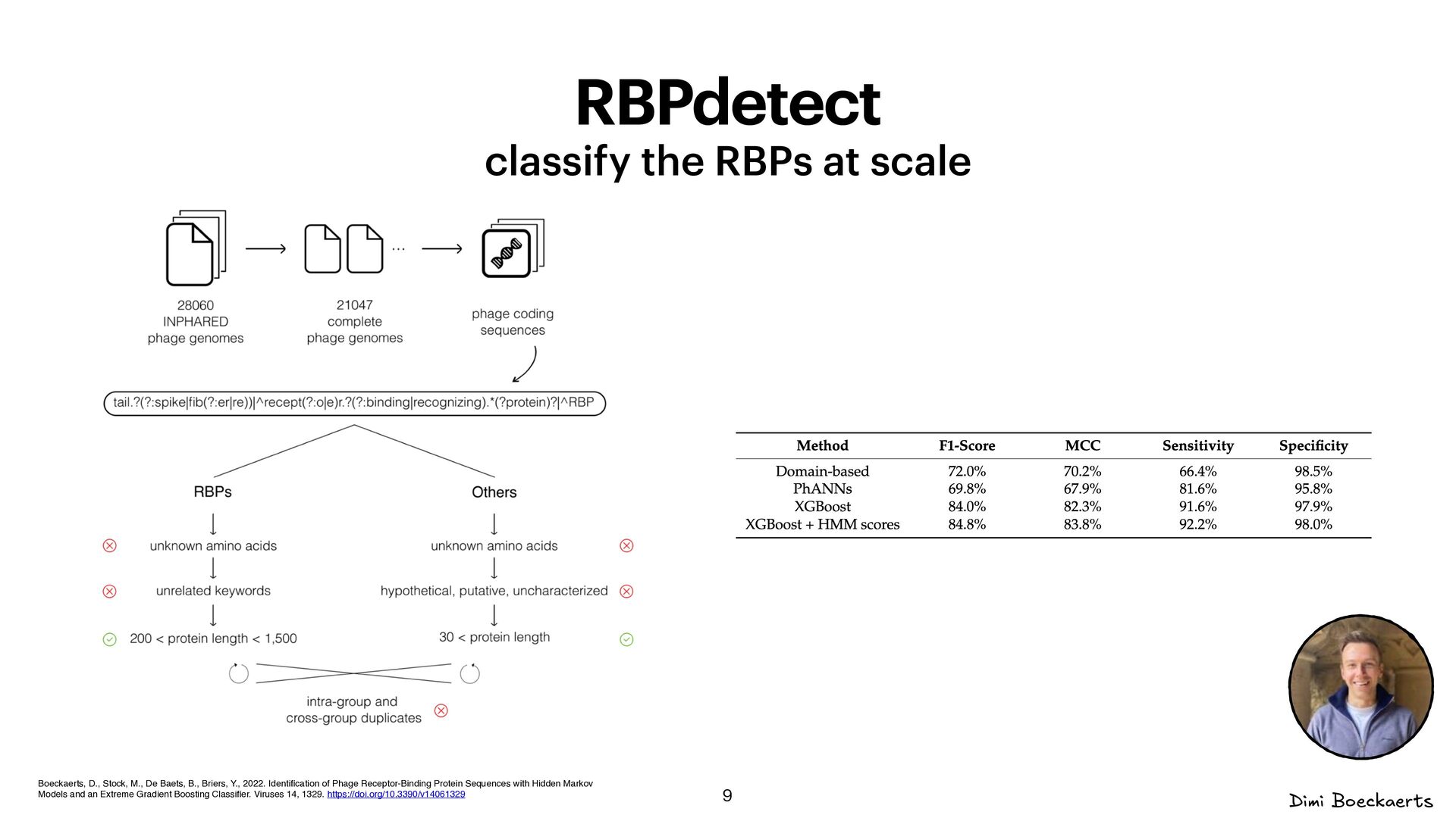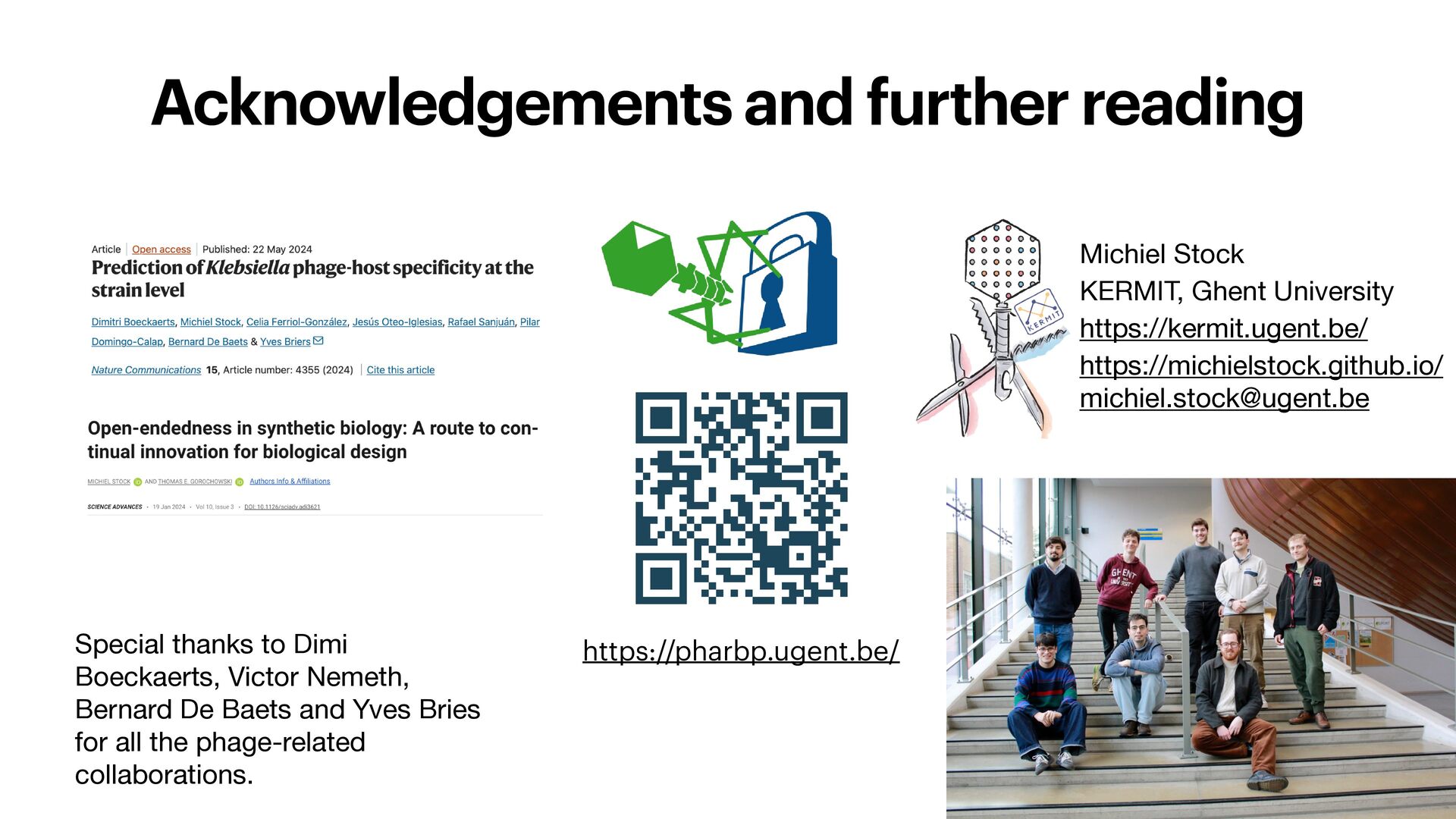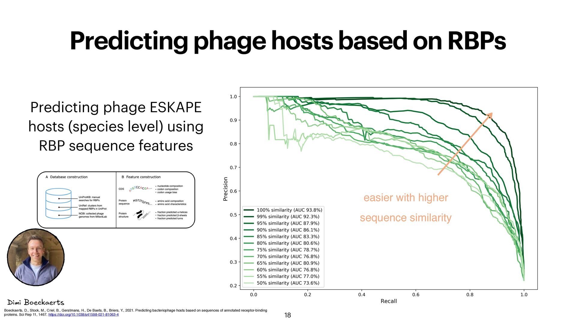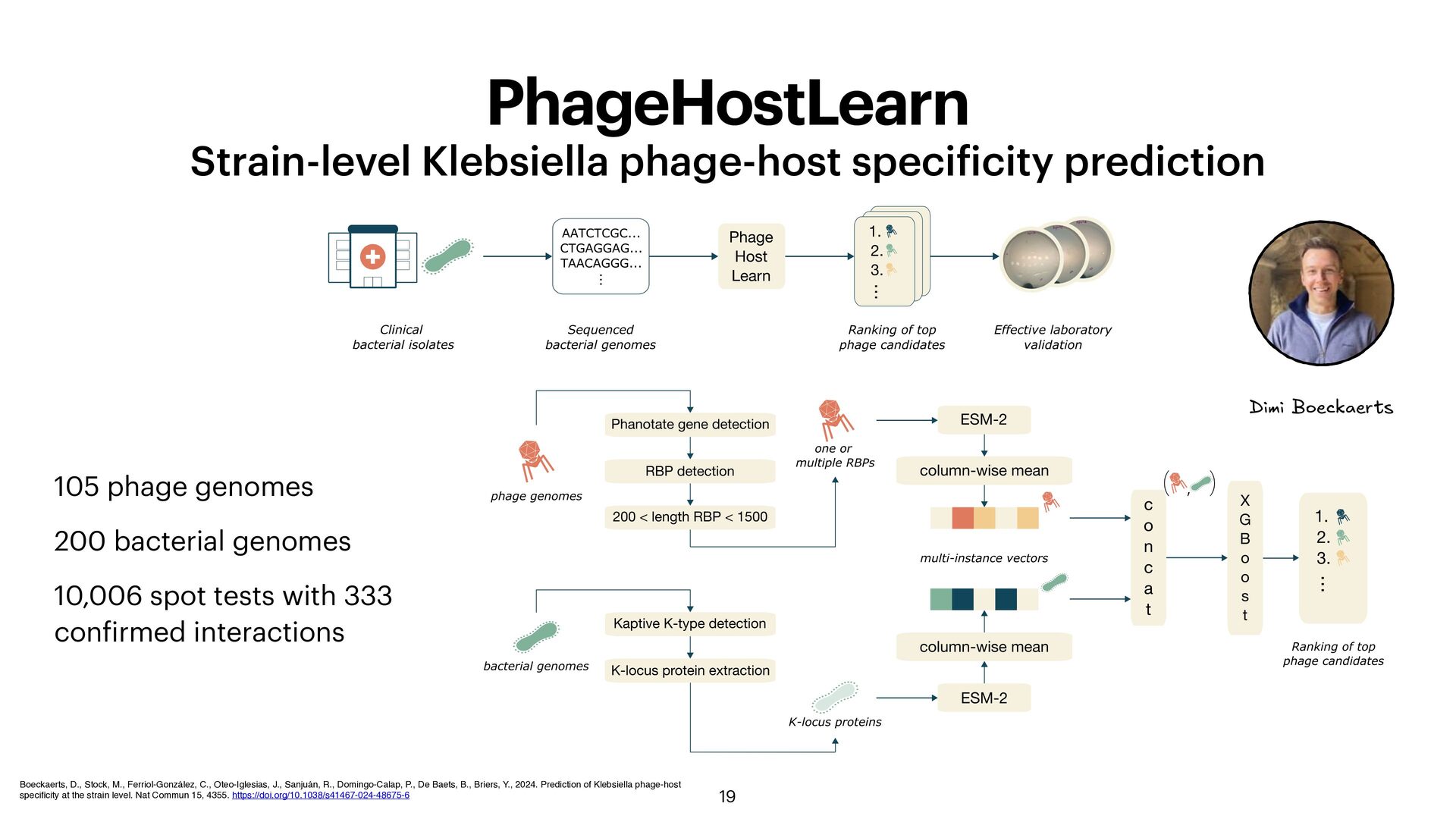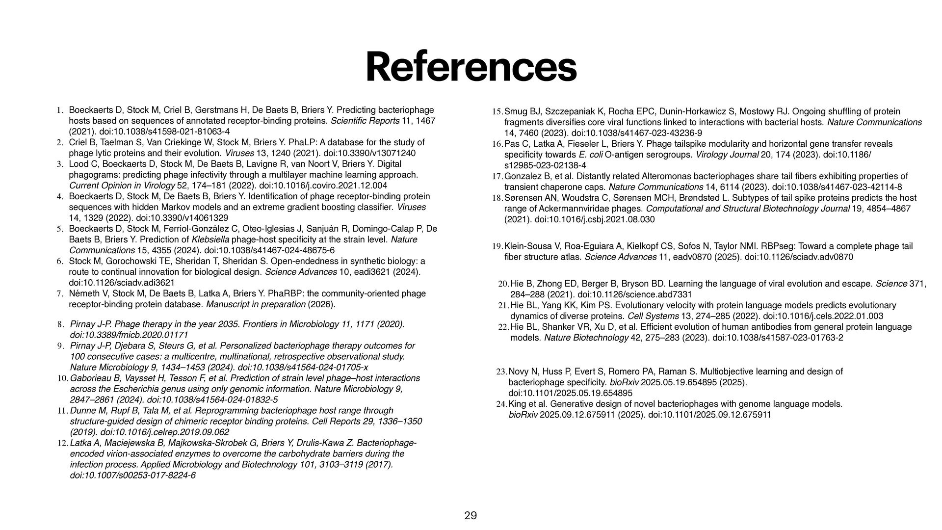 H, De Baets B, Briers Y. Predicting bacteriophage hosts based on sequences of annotated receptor-binding proteins. Scienti fi c Reports 11, 1467 (2021). doi:10.1038/s41598-021-81063-4 2. Criel B, Taelman S, Van Criekinge W, Stock M, Briers Y. PhaLP: A database for the study of phage lytic proteins and their evolution. Viruses 13, 1240 (2021). doi:10.3390/v13071240 3. Lood C, Boeckaerts D, Stock M, De Baets B, Lavigne R, van Noort V, Briers Y. Digital phagograms: predicting phage infectivity through a multilayer machine learning approach. Current Opinion in Virology 52, 174–181 (2022). doi:10.1016/j.coviro.2021.12.004 4. Boeckaerts D, Stock M, De Baets B, Briers Y. Identi fi cation of phage receptor-binding protein sequences with hidden Markov models and an extreme gradient boosting classi fi er. Viruses 14, 1329 (2022). doi:10.3390/v14061329 5. Boeckaerts D, Stock M, Ferriol-González C, Oteo-Iglesias J, Sanjuán R, Domingo-Calap P, De Baets B, Briers Y. Prediction of Klebsiella phage-host speci fi city at the strain level. Nature Communications 15, 4355 (2024). doi:10.1038/s41467-024-48675-6 6. Stock M, Gorochowski TE, Sheridan T, Sheridan S. Open-endedness in synthetic biology: a route to continual innovation for biological design. Science Advances 10, eadi3621 (2024). doi:10.1126/sciadv.adi3621 7. Németh V, Stock M, De Baets B, Latka A, Briers Y. PhaRBP: the community-oriented phage receptor-binding protein database. Manuscript in preparation (2026). 8. Pirnay J-P. Phage therapy in the year 2035. Frontiers in Microbiology 11, 1171 (2020). doi:10.3389/fmicb.2020.01171 9. Pirnay J-P, Djebara S, Steurs G, et al. Personalized bacteriophage therapy outcomes for 100 consecutive cases: a multicentre, multinational, retrospective observational study. Nature Microbiology 9, 1434–1453 (2024). doi:10.1038/s41564-024-01705-x 10.Gaborieau B, Vaysset H, Tesson F, et al. Prediction of strain level phage–host interactions across the Escherichia genus using only genomic information. Nature Microbiology 9, 2847–2861 (2024). doi:10.1038/s41564-024-01832-5 11. Dunne M, Rupf B, Tala M, et al. Reprogramming bacteriophage host range through structure-guided design of chimeric receptor binding proteins. Cell Reports 29, 1336–1350 (2019). doi:10.1016/j.celrep.2019.09.062 12.Latka A, Maciejewska B, Majkowska-Skrobek G, Briers Y, Drulis-Kawa Z. Bacteriophage- encoded virion-associated enzymes to overcome the carbohydrate barriers during the infection process. Applied Microbiology and Biotechnology 101, 3103–3119 (2017). doi:10.1007/s00253-017-8224-6 15.Smug BJ, Szczepaniak K, Rocha EPC, Dunin-Horkawicz S, Mostowy RJ. Ongoing shuf fl ing of protein fragments diversi fi es core viral functions linked to interactions with bacterial hosts. Nature Communications 14, 7460 (2023). doi:10.1038/s41467-023-43236-9 16.Pas C, Latka A, Fieseler L, Briers Y. Phage tailspike modularity and horizontal gene transfer reveals speci fi city towards E. coli O-antigen serogroups. Virology Journal 20, 174 (2023). doi:10.1186/ s12985-023-02138-4 17.Gonzalez B, et al. Distantly related Alteromonas bacteriophages share tail fi bers exhibiting properties of transient chaperone caps. Nature Communications 14, 6114 (2023). doi:10.1038/s41467-023-42114-8 18.Sørensen AN, Woudstra C, Sørensen MCH, Brøndsted L. Subtypes of tail spike proteins predicts the host range of Ackermannviridae phages. Computational and Structural Biotechnology Journal 19, 4854–4867 (2021). doi:10.1016/j.csbj.2021.08.030 19.Klein-Sousa V, Roa-Eguiara A, Kielkopf CS, Sofos N, Taylor NMI. RBPseg: Toward a complete phage tail fi ber structure atlas. Science Advances 11, eadv0870 (2025). doi:10.1126/sciadv.adv0870 20.Hie B, Zhong ED, Berger B, Bryson BD. Learning the language of viral evolution and escape. Science 371, 284–288 (2021). doi:10.1126/science.abd7331 21.Hie BL, Yang KK, Kim PS. Evolutionary velocity with protein language models predicts evolutionary dynamics of diverse proteins. Cell Systems 13, 274–285 (2022). doi:10.1016/j.cels.2022.01.003 22.Hie BL, Shanker VR, Xu D, et al. Ef fi cient evolution of human antibodies from general protein language models. Nature Biotechnology 42, 275–283 (2023). doi:10.1038/s41587-023-01763-2 23.Novy N, Huss P, Evert S, Romero PA, Raman S. Multiobjective learning and design of bacteriophage speci fi city. bioRxiv 2025.05.19.654895 (2025). doi:10.1101/2025.05.19.654895 24.King et al. Generative design of novel bacteriophages with genome language models. bioRxiv 2025.09.12.675911 (2025). doi:10.1101/2025.09.12.675911