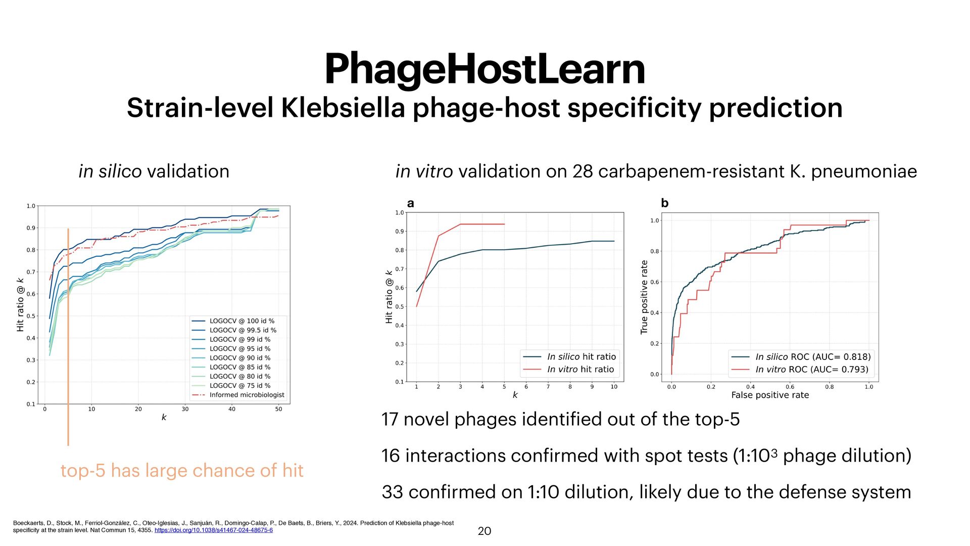 silico validation in vitro validation on 28 carbapenem-resistant K. pneumoniae 17 novel phages identi f ied out of the top-5 16 interactions con f irmed with spot tests (1:103 phage dilution) 33 con f irmed on 1:10 dilution, likely due to the defense system Boeckaerts, D., Stock, M., Ferriol-González, C., Oteo-Iglesias, J., Sanjuán, R., Domingo-Calap, P., De Baets, B., Briers, Y., 2024. Prediction of Klebsiella phage-host speci fi city at the strain level. Nat Commun 15, 4355. https://doi.org/10.1038/s41467-024-48675-6 top-5 has large chance of hit