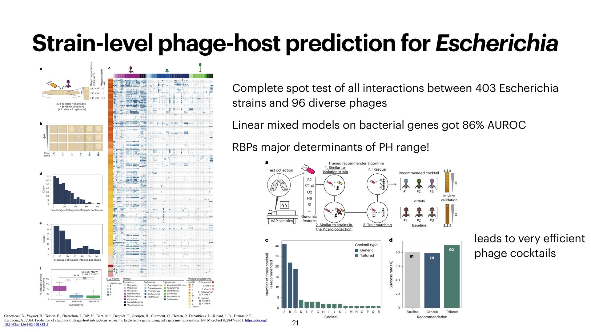 Tesson, F., Charachon, I., Dib, N., Bernier, J., Dequidt, T., Georjon, H., Clermont, O., Hersen, P., Debarbieux, L., Ricard, J.-D., Denamur, E., Bernheim, A., 2024. Prediction of strain level phage–host interactions across the Escherichia genus using only genomic information. Nat Microbiol 9, 2847–2861. https://doi.org/ 10.1038/s41564-024-01832-5 Complete spot test of all interactions between 403 Escherichia strains and 96 diverse phages Linear mixed models on bacterial genes got 86% AUROC RBPs major determinants of PH range! leads to very e ff icient phage cocktails
