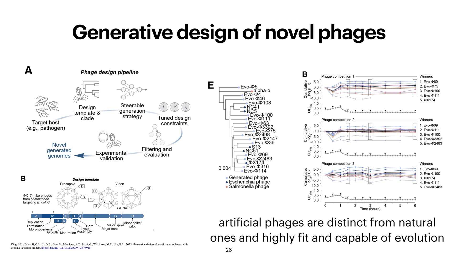 Li, D.B., Guo, D., Merchant, A.T., Brixi, G., Wilkinson, M.E., Hie, B.L., 2025. Generative design of novel bacteriophages with genome language models. https://doi.org/10.1101/2025.09.12.675911 arti f icial phages are distinct from natural ones and highly f it and capable of evolution
