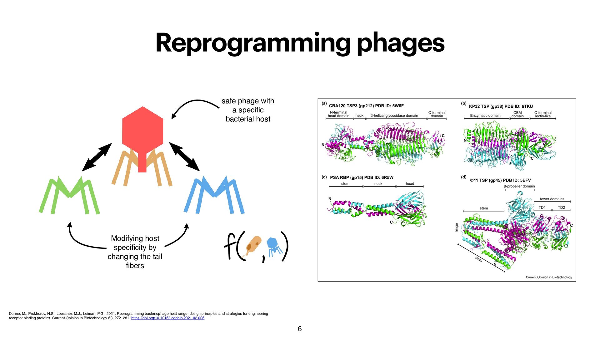 speci fi c bacterial host Modifying host speci fi city by changing the tail fi bers Dunne, M., Prokhorov, N.S., Loessner, M.J., Leiman, P.G., 2021. Reprogramming bacteriophage host range: design principles and strategies for engineering receptor binding proteins. Current Opinion in Biotechnology 68, 272–281. https://doi.org/10.1016/j.copbio.2021.02.006