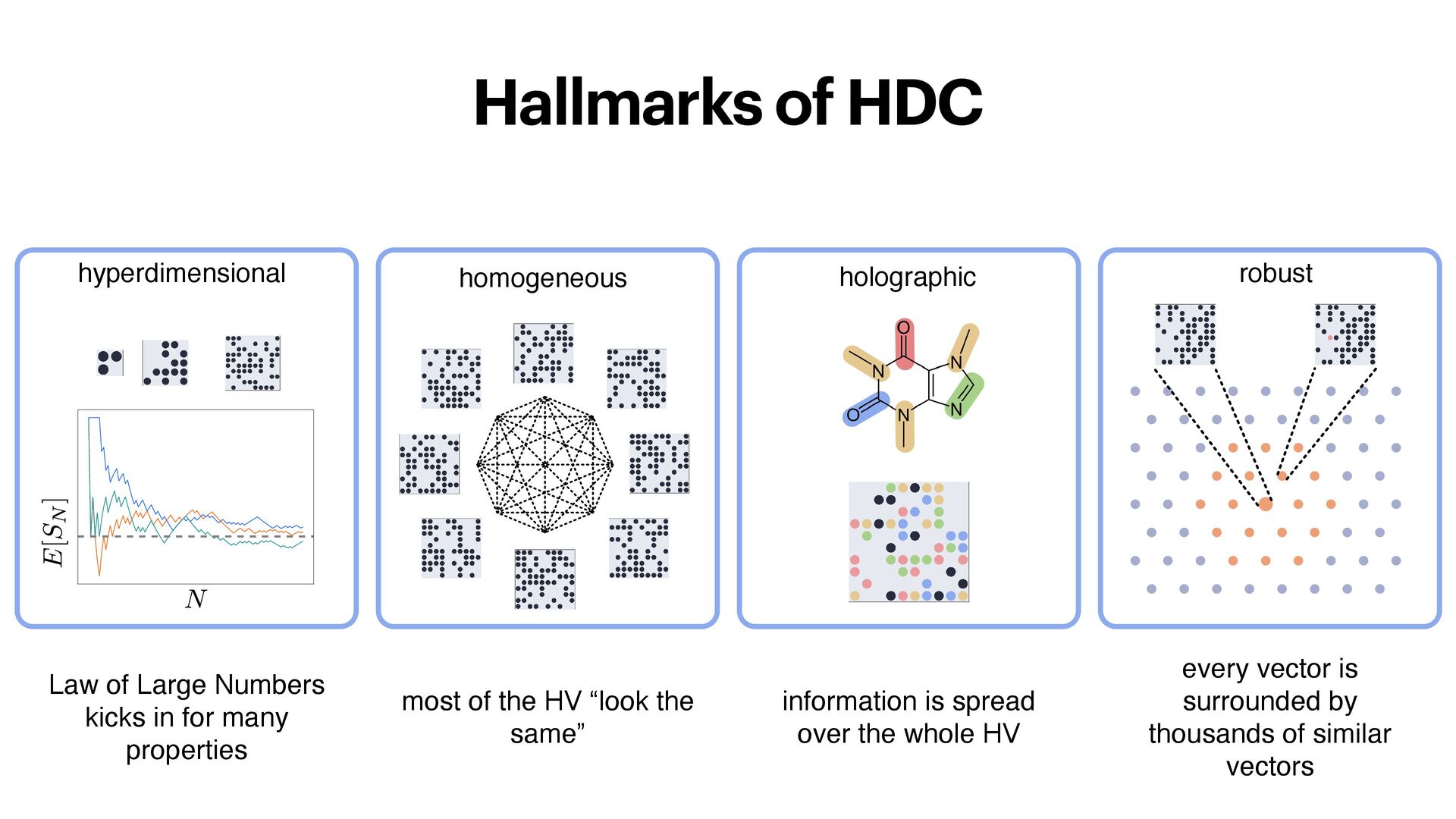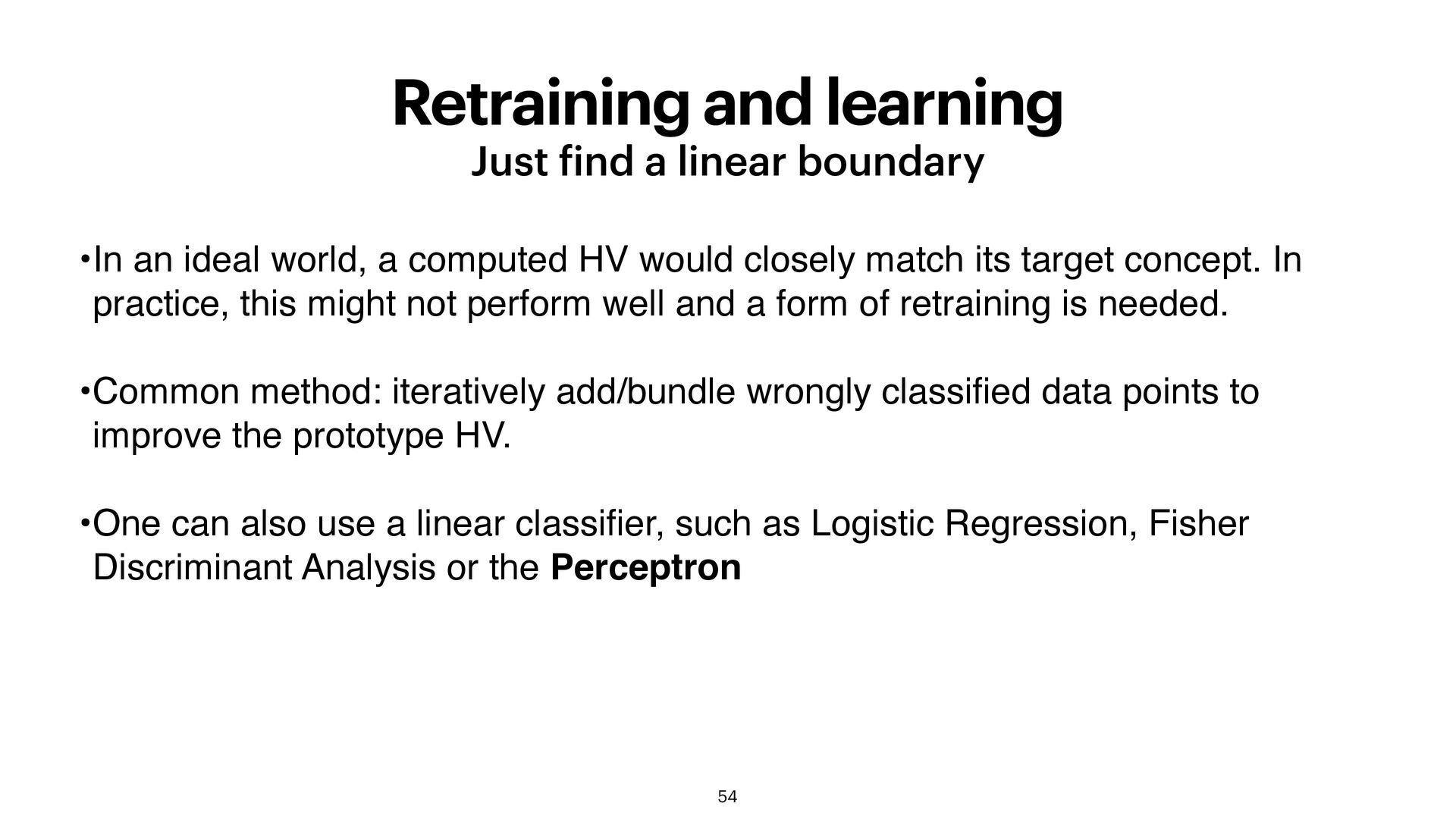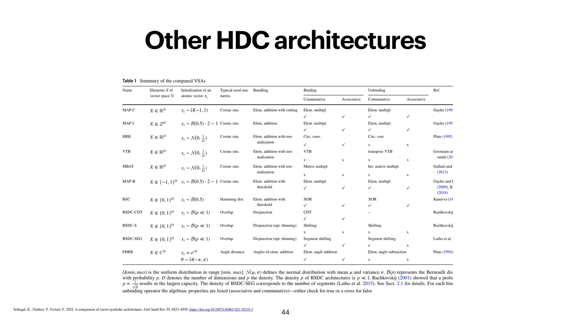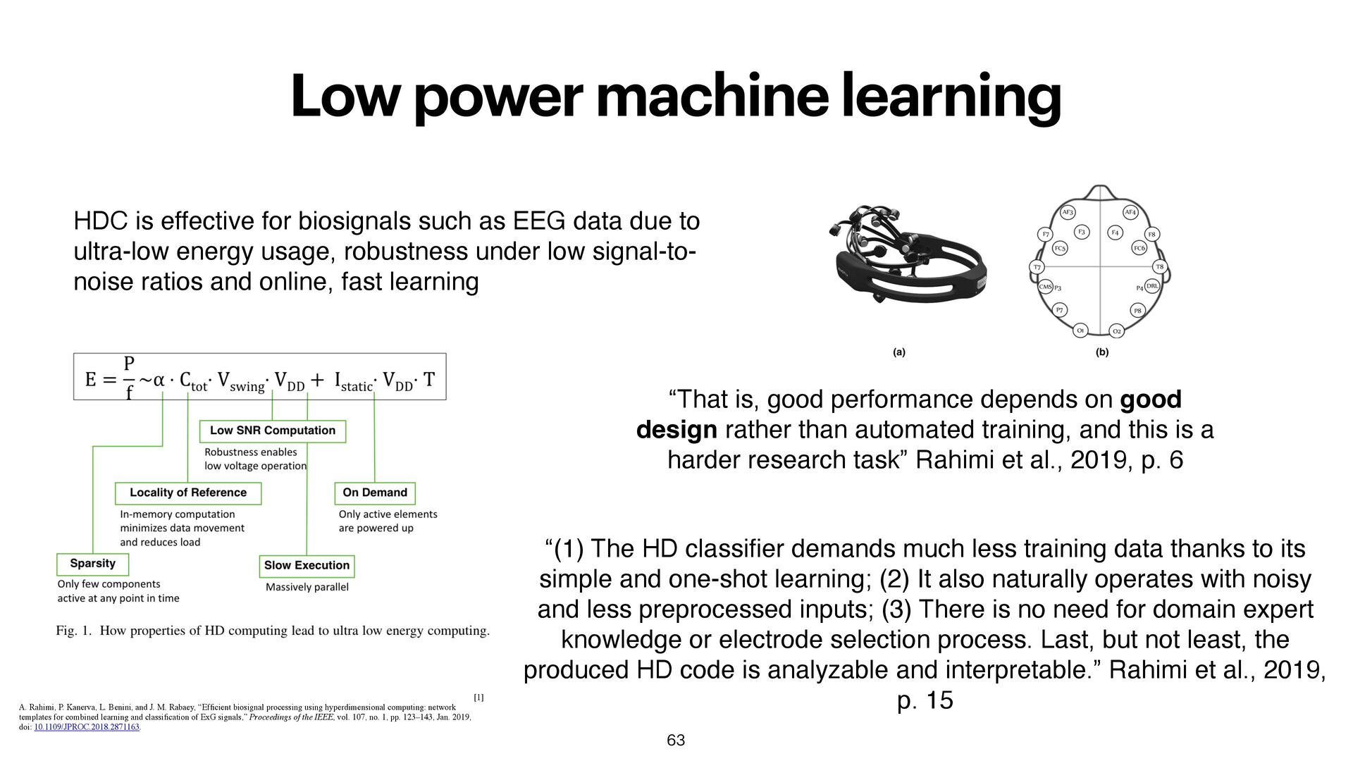 L. Benini, and J. M. Rabaey, “Ef fi cient biosignal processing using hyperdimensional computing: network templates for combined learning and classi fi cation of ExG signals,” Proceedings of the IEEE, vol. 107, no. 1, pp. 123–143, Jan. 2019, doi: 10.1109/JPROC.2018.2871163. HDC is effective for biosignals such as EEG data due to ultra-low energy usage, robustness under low signal-to- noise ratios and online, fast learning “That is, good performance depends on good design rather than automated training, and this is a harder research task” Rahimi et al., 2019, p. 6 “(1) The HD classi fi er demands much less training data thanks to its simple and one-shot learning; (2) It also naturally operates with noisy and less preprocessed inputs; (3) There is no need for domain expert knowledge or electrode selection process. Last, but not least, the produced HD code is analyzable and interpretable.” Rahimi et al., 2019, p. 15