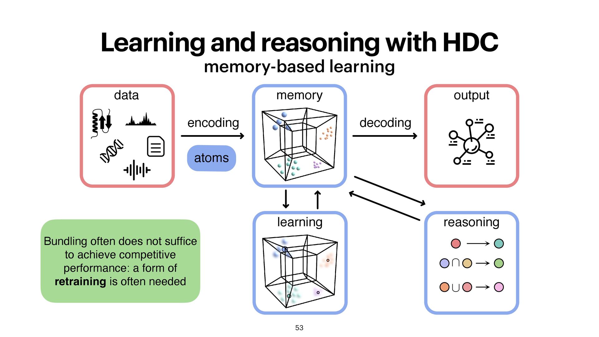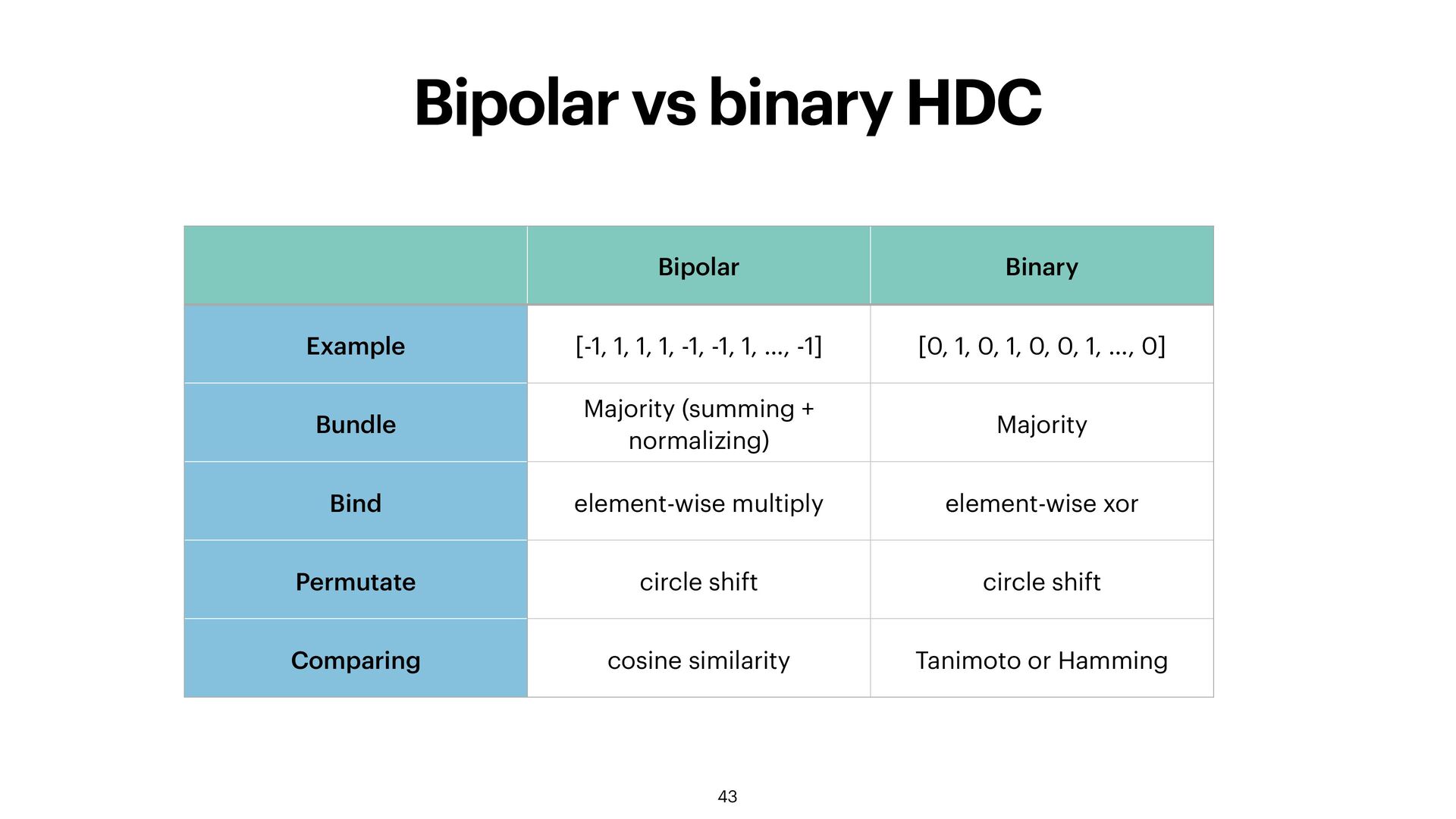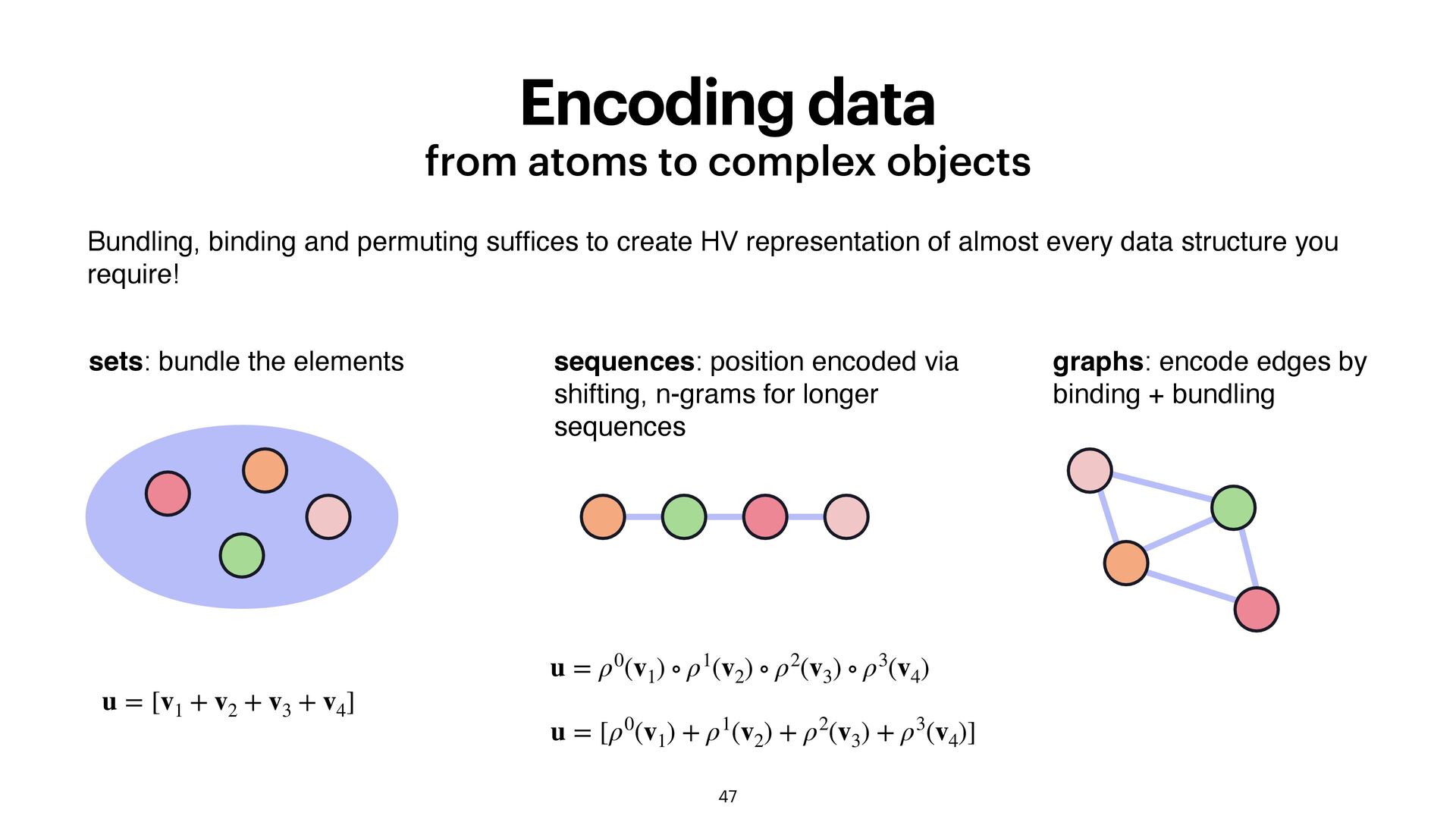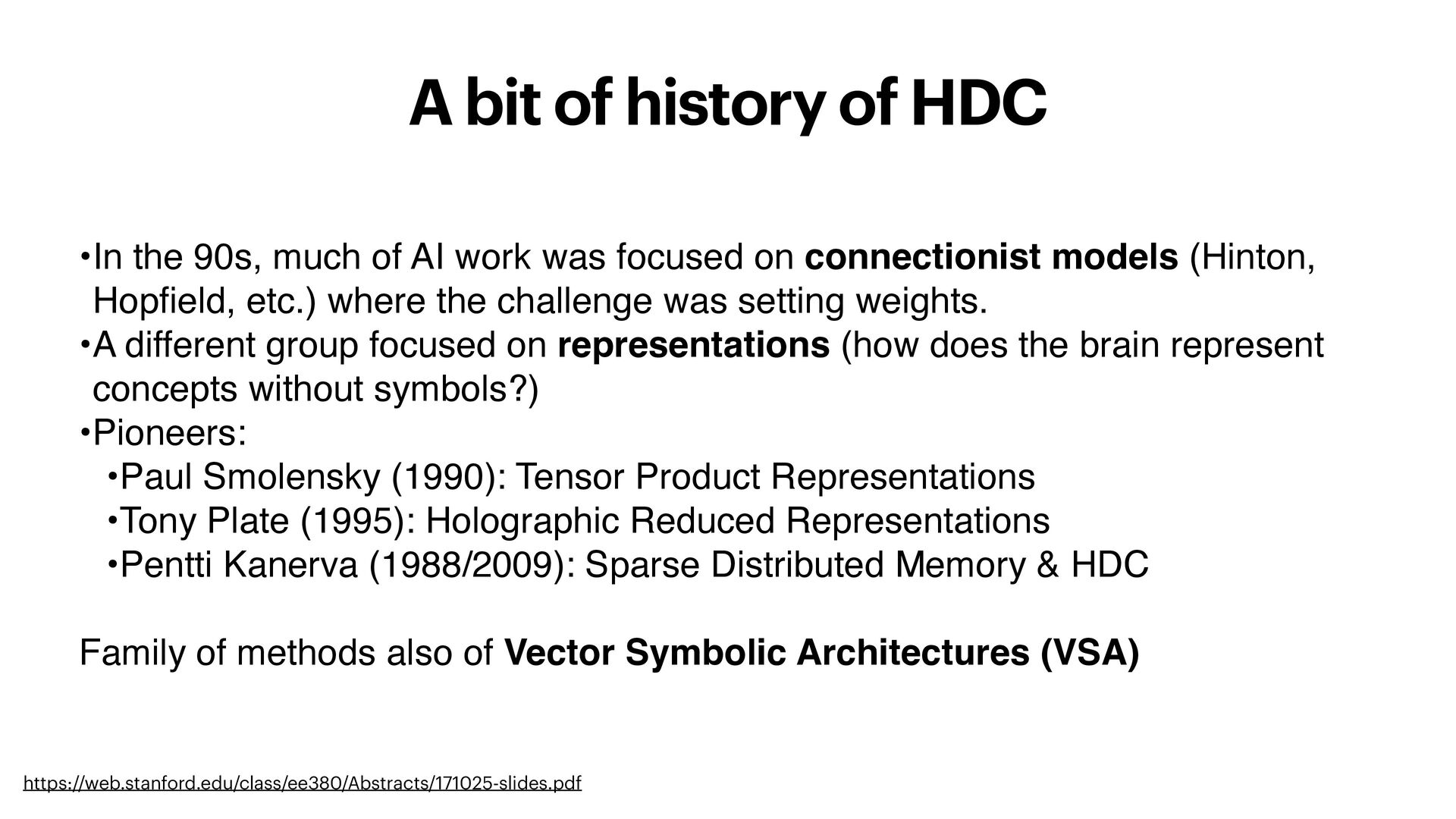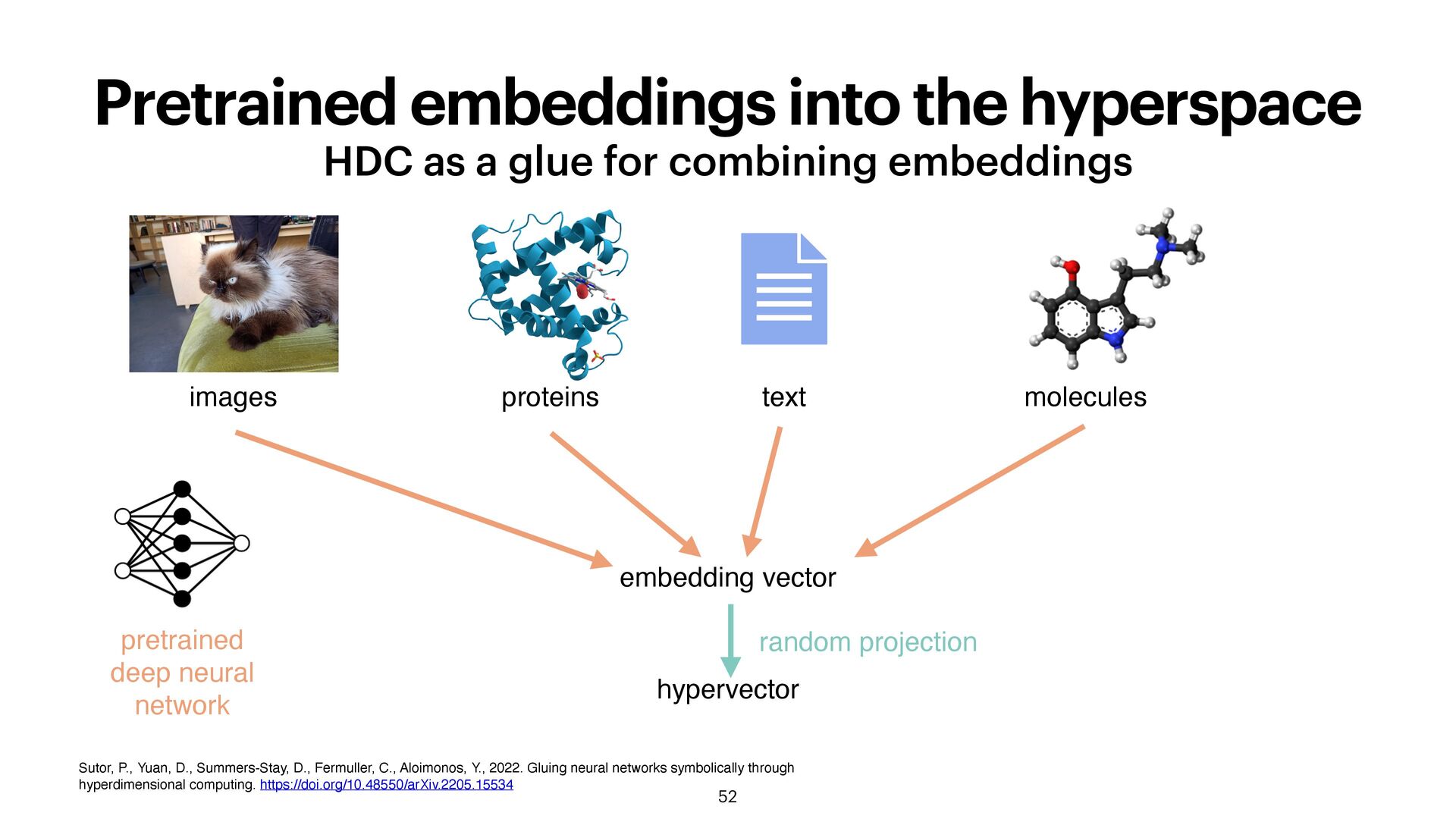 L. Benini, and J. M. Rabaey, “Ef fi cient biosignal processing using hyperdimensional computing: network templates for combined learning and classi fi cation of ExG signals,” Proceedings of the IEEE, vol. 107, no. 1, pp. 123–143, Jan. 2019, doi: 10.1109/JPROC.2018.2871163. HDC is effective for biosignals such as EEG data due to ultra-low energy usage, robustness under low signal-to- noise ratios and online, fast learning “That is, good performance depends on good design rather than automated training, and this is a harder research task” Rahimi et al., 2019, p. 6 “(1) The HD classi fi er demands much less training data thanks to its simple and one-shot learning; (2) It also naturally operates with noisy and less preprocessed inputs; (3) There is no need for domain expert knowledge or electrode selection process. Last, but not least, the produced HD code is analyzable and interpretable.” Rahimi et al., 2019, p. 15