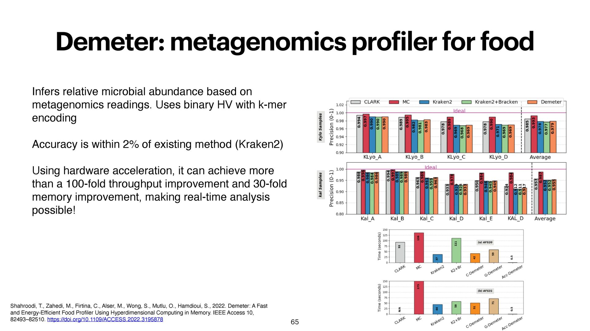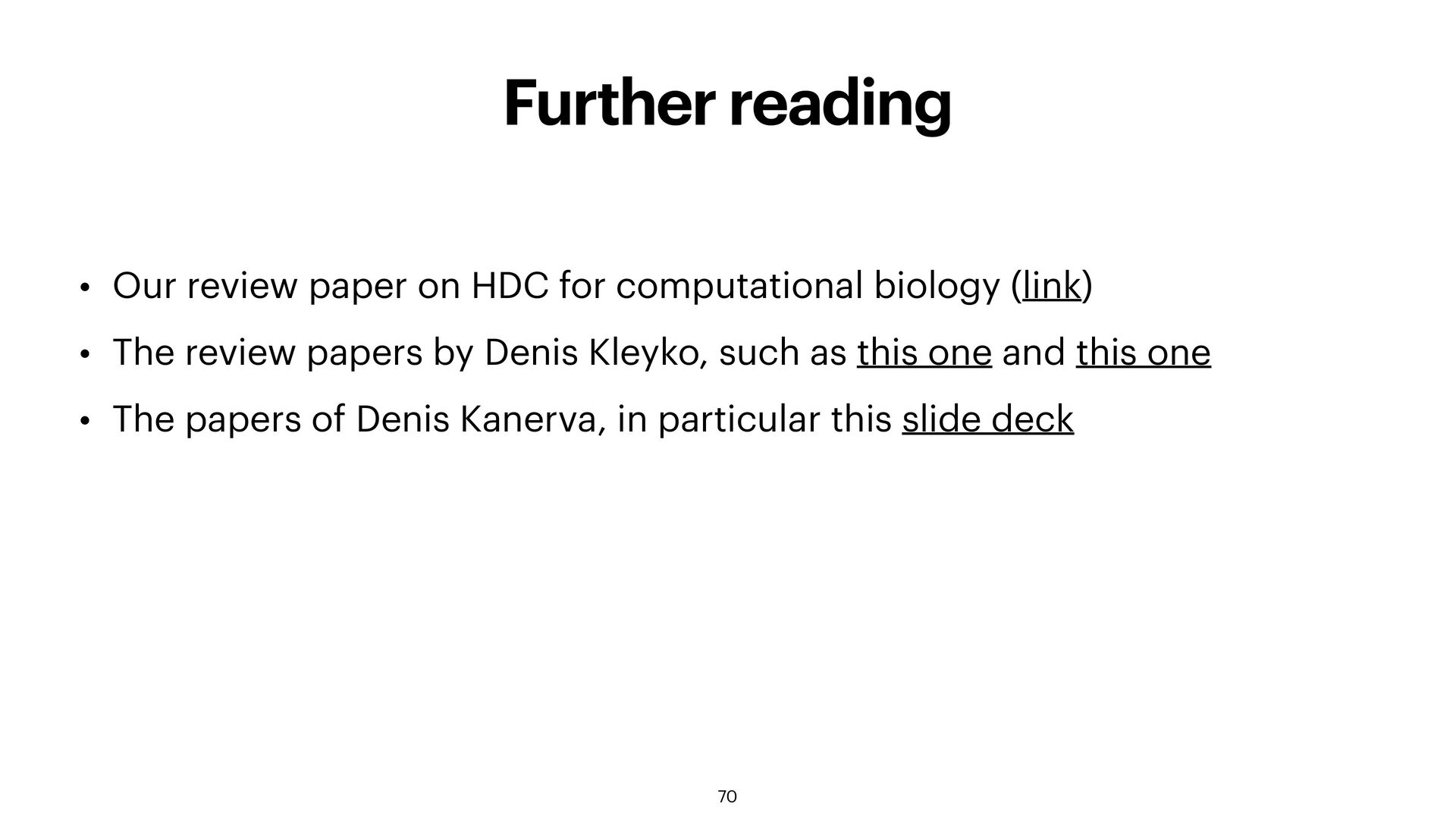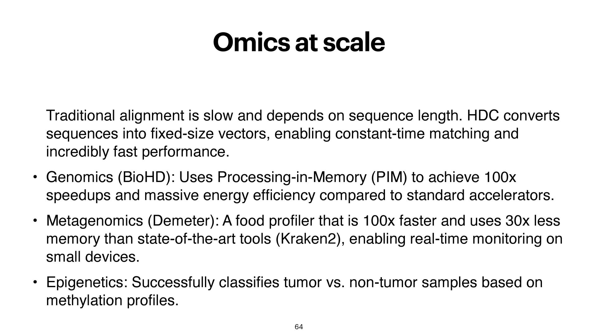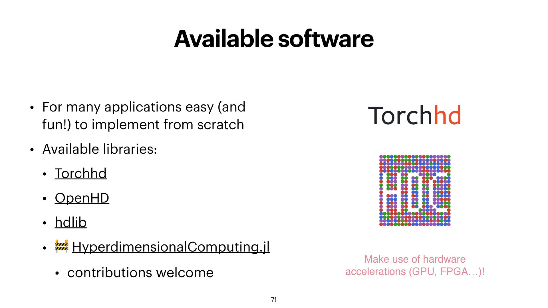 L. Benini, and J. M. Rabaey, “Ef fi cient biosignal processing using hyperdimensional computing: network templates for combined learning and classi fi cation of ExG signals,” Proceedings of the IEEE, vol. 107, no. 1, pp. 123–143, Jan. 2019, doi: 10.1109/JPROC.2018.2871163. HDC is effective for biosignals such as EEG data due to ultra-low energy usage, robustness under low signal-to- noise ratios and online, fast learning “That is, good performance depends on good design rather than automated training, and this is a harder research task” Rahimi et al., 2019, p. 6 “(1) The HD classi fi er demands much less training data thanks to its simple and one-shot learning; (2) It also naturally operates with noisy and less preprocessed inputs; (3) There is no need for domain expert knowledge or electrode selection process. Last, but not least, the produced HD code is analyzable and interpretable.” Rahimi et al., 2019, p. 15