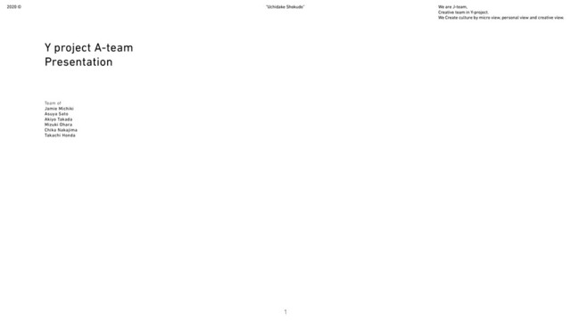 Creative team in Y-project. We Create culture by micro view, personal view and creative view. “Uchidake Shokudo” Team of Jamie Michiki Asuya Sato Akiyo Takada Mizuki Ohara Chika Nakajima Takachi Honda