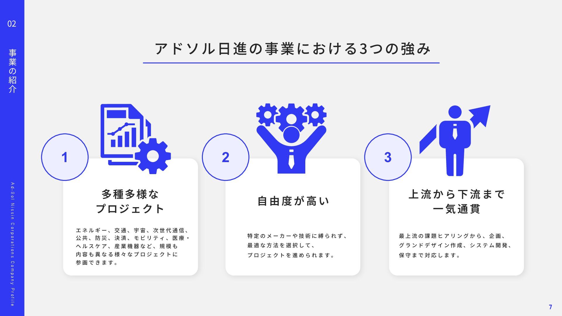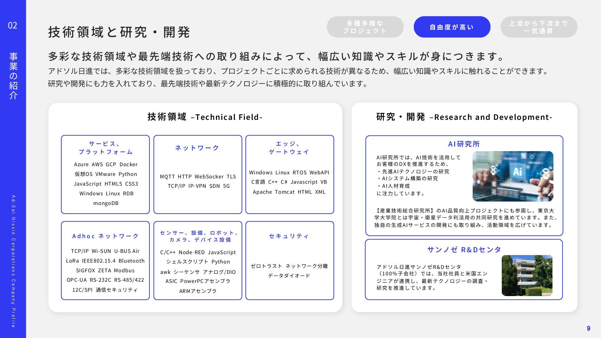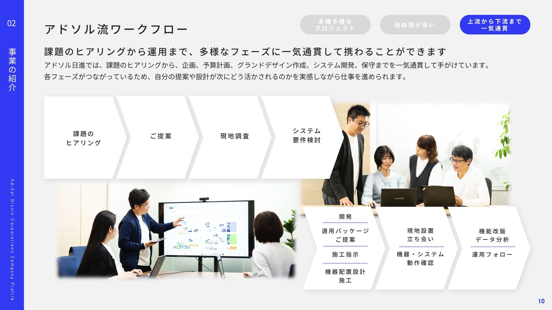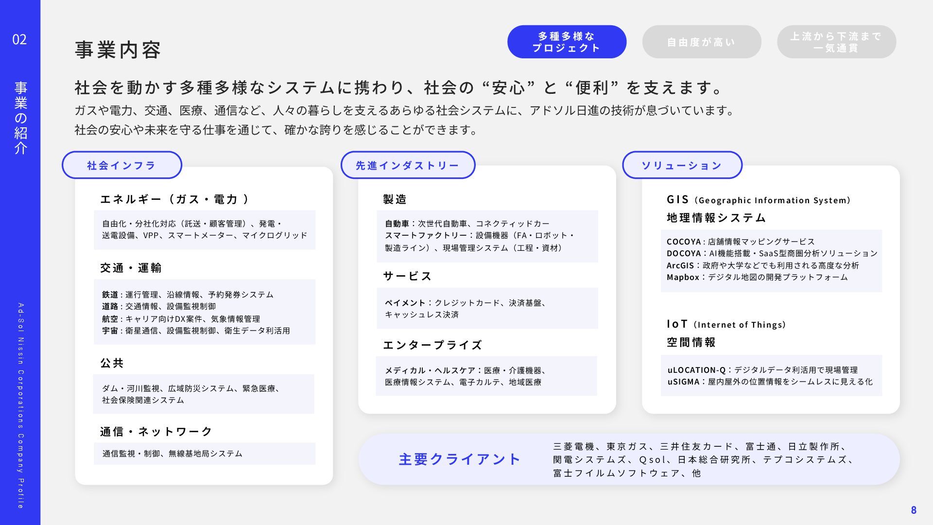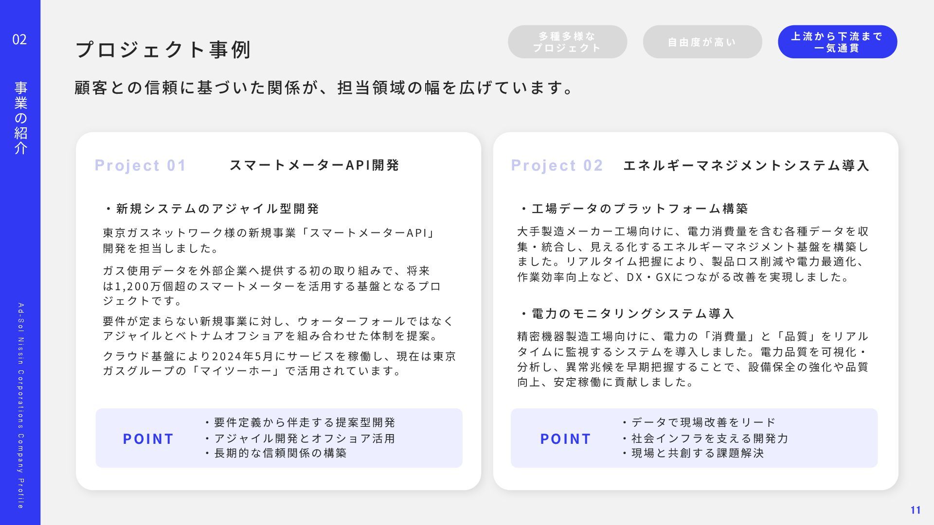 o l N i s s i n C o r p o r a t i o n s C o m p a n y P r o f i l e 02 事 業 の 紹 介 顧客との信頼に基づいた関係が、担当領域の幅を広げています。 多 種 多 様 な プ ロ ジ ェ ク ト ⾃ 由 度 が ⾼ い 上 流 か ら 下 流 ま で ⼀ 気 通 貫 Project 01 Project 02 ス マ ー ト メ ー タ ー A PI 開 発 エ ネ ル ギ ー マ ネ ジ メ ン ト シ ス テ ム 導 ⼊ ‧ 新 規 シ ス テ ム の ア ジ ャ イ ル 型 開 発 東京ガスネットワーク様の新規事業「スマートメーターA P I 」 開発を担当しました。 ガス使⽤データを外部企業へ提供する初の取り組みで、将来 は1 , 2 0 0 万個超のスマートメーターを活⽤する基盤となるプロ ジェクトです。 要件が定まらない新規事業に対し、ウォーターフォールではなく アジャイルとベトナムオフショアを組み合わせた体制を提案。 クラウド基盤により2 0 2 4 年5 ⽉にサービスを稼働し、現在は東京 ガスグループの「マイツーホー」で活⽤されています。 POINT ‧要件定義から伴⾛する提案型開発 ‧アジャイル開発とオフショア活⽤ ‧⻑期的な信頼関係の構築 ‧ ⼯ 場 デ ー タ の プ ラ ッ ト フ ォ ー ム 構 築 ⼤⼿製造メーカー⼯場向けに、電⼒消費量を含む各種データを収 集‧統合し、⾒える化するエネルギーマネジメント基盤を構築し ました。リアルタイム把握により、製品ロス削減や電⼒最適化、 作業効率向上など、D X ‧G X につながる改善を実現しました。 ‧ 電 ⼒ の モ ニ タ リ ン グ シ ス テ ム 導 ⼊ 精密機器製造⼯場向けに、電⼒の「消費量」と「品質」をリアル タイムに監視するシステムを導⼊しました。電⼒品質を可視化‧ 分析し、異常兆候を早期把握することで、設備保全の強化や品質 向上、安定稼働に貢献しました。 POINT ‧データで現場改善をリード ‧社会インフラを⽀える開発⼒ ‧現場と共創する課題解決 11