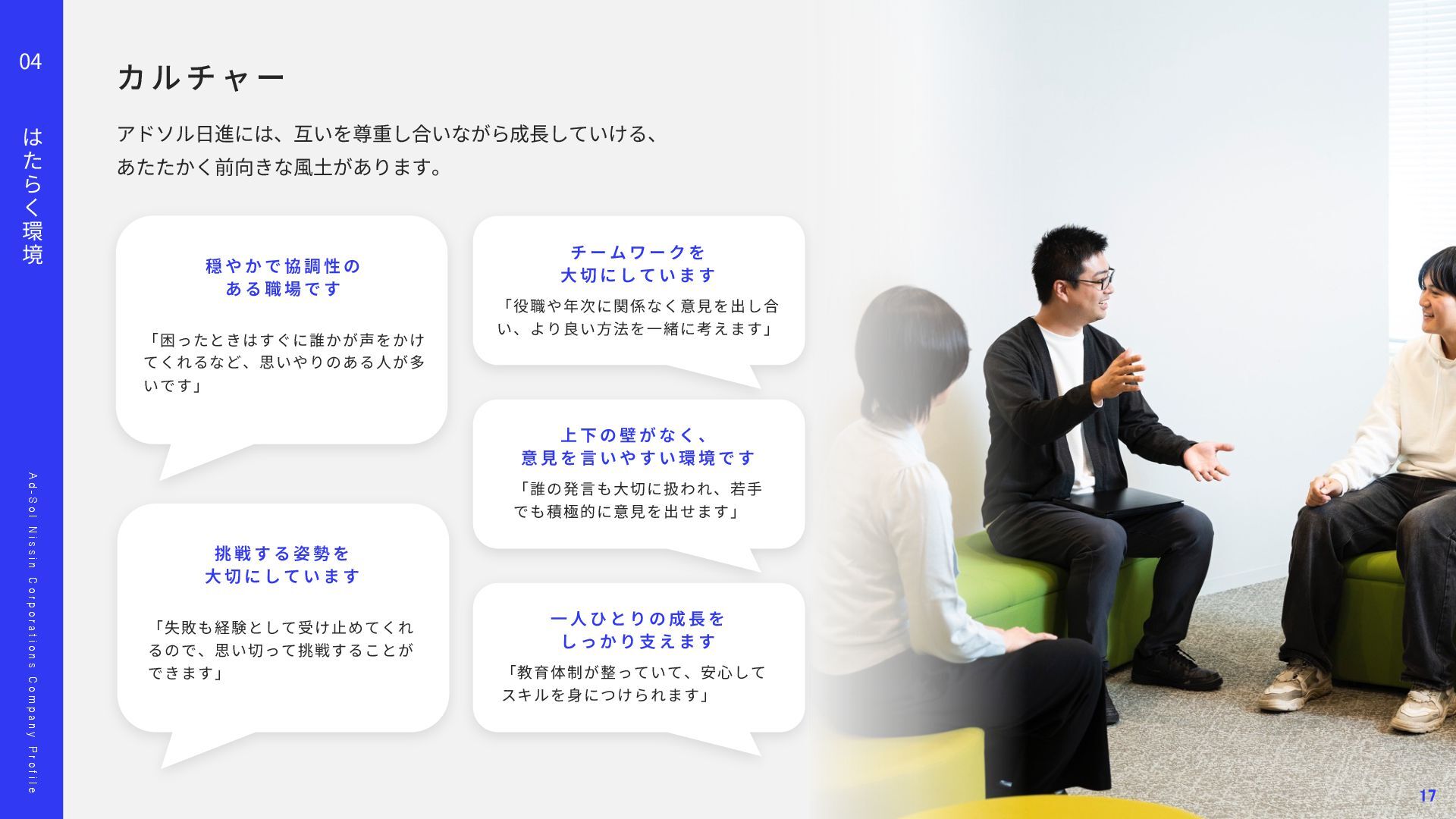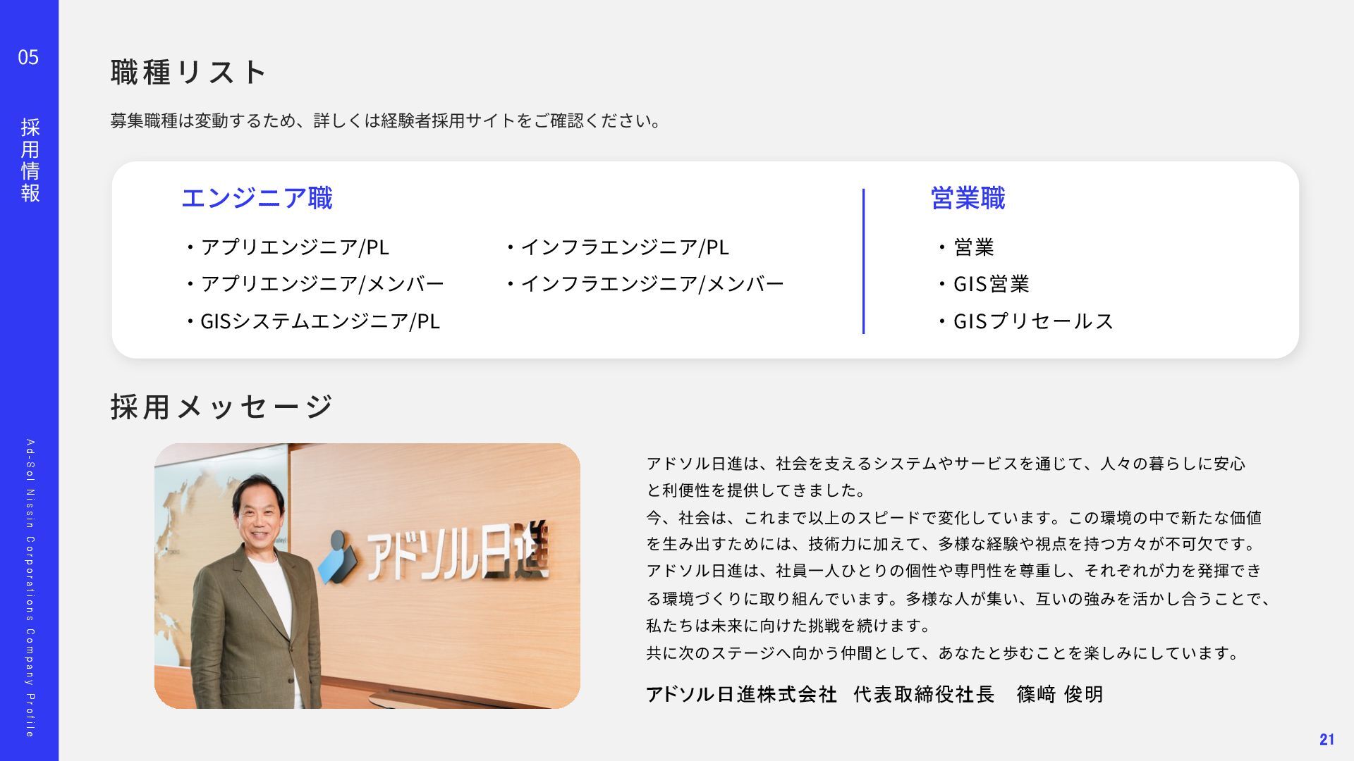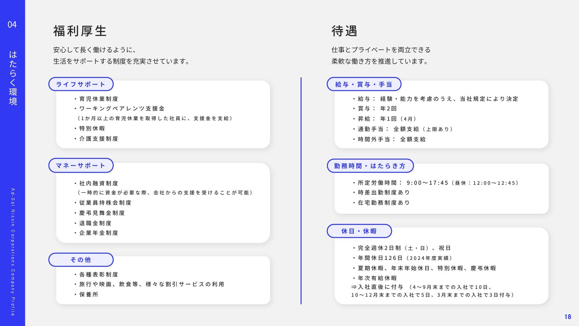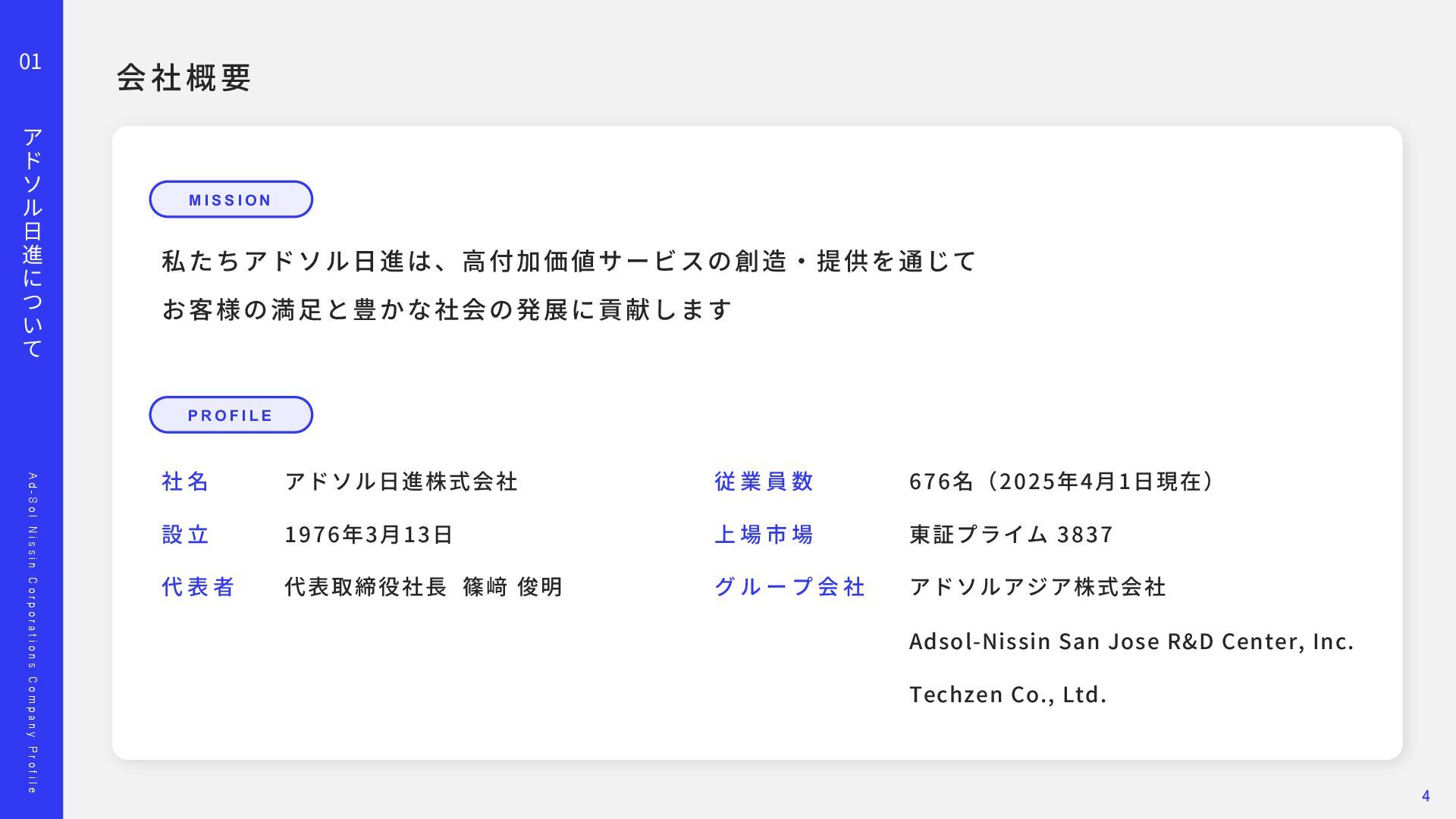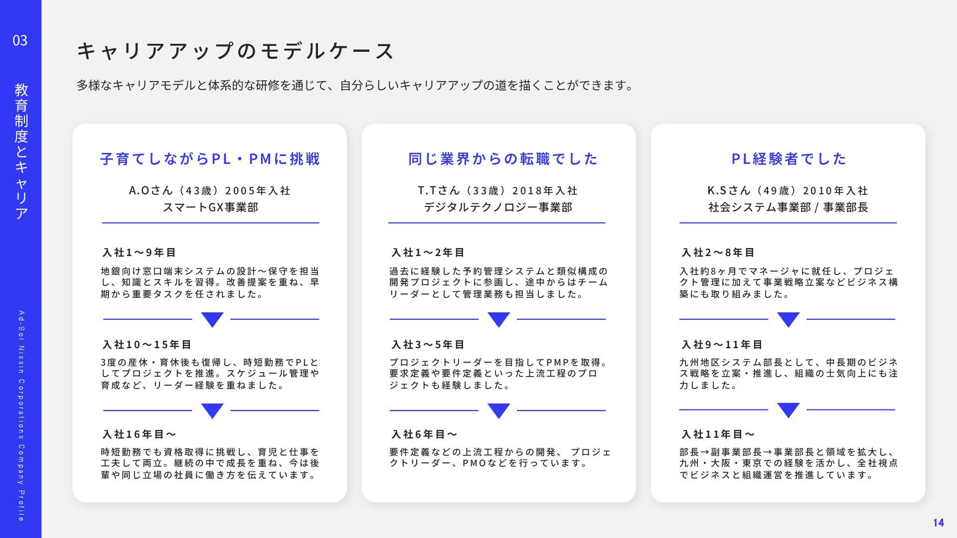o l N i s s i n C o r p o r a t i o n s C o m p a n y P r o f i l e 02 事 業 の 紹 介 顧客との信頼に基づいた関係が、担当領域の幅を広げています。 多 種 多 様 な プ ロ ジ ェ ク ト ⾃ 由 度 が ⾼ い 上 流 か ら 下 流 ま で ⼀ 気 通 貫 Project 01 Project 02 ス マ ー ト メ ー タ ー A PI 開 発 エ ネ ル ギ ー マ ネ ジ メ ン ト シ ス テ ム 導 ⼊ ‧ 新 規 シ ス テ ム の ア ジ ャ イ ル 型 開 発 東京ガスネットワーク様の新規事業「スマートメーターA P I 」 開発を担当しました。 ガス使⽤データを外部企業へ提供する初の取り組みで、将来 は1 , 2 0 0 万個超のスマートメーターを活⽤する基盤となるプロ ジェクトです。 要件が定まらない新規事業に対し、ウォーターフォールではなく アジャイルとベトナムオフショアを組み合わせた体制を提案。 クラウド基盤により2 0 2 4 年5 ⽉にサービスを稼働し、現在は東京 ガスグループの「マイツーホー」で活⽤されています。 POINT ‧要件定義から伴⾛する提案型開発 ‧アジャイル開発とオフショア活⽤ ‧⻑期的な信頼関係の構築 ‧ ⼯ 場 デ ー タ の プ ラ ッ ト フ ォ ー ム 構 築 ⼤⼿製造メーカー⼯場向けに、電⼒消費量を含む各種データを収 集‧統合し、⾒える化するエネルギーマネジメント基盤を構築し ました。リアルタイム把握により、製品ロス削減や電⼒最適化、 作業効率向上など、D X ‧G X につながる改善を実現しました。 ‧ 電 ⼒ の モ ニ タ リ ン グ シ ス テ ム 導 ⼊ 精密機器製造⼯場向けに、電⼒の「消費量」と「品質」をリアル タイムに監視するシステムを導⼊しました。電⼒品質を可視化‧ 分析し、異常兆候を早期把握することで、設備保全の強化や品質 向上、安定稼働に貢献しました。 POINT ‧データで現場改善をリード ‧社会インフラを⽀える開発⼒ ‧現場と共創する課題解決 11
