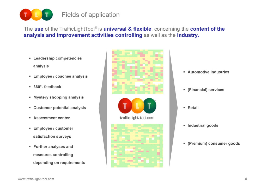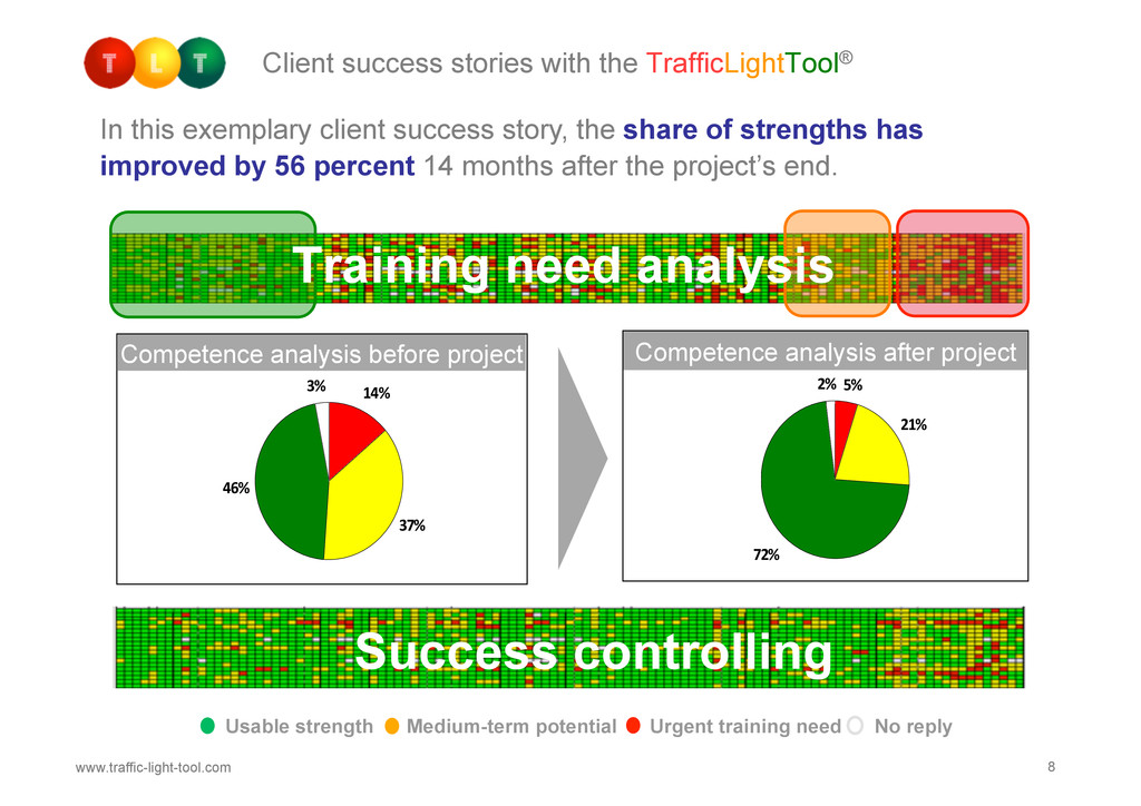 TrafficLightTool is a web based talent management tool to support your qualification, training & coaching and change projects. From talent qualification to sustained learning, TLT helps both plan your resources effectively and measure the outcome of your investment. Based on a pragmatic analytical concept, the 100% web based system covers the whole change management process, including tools for booking/ordering, e-learning, day-to-day coaching, feedback and follow-up. Comprehensive analysis and benchmarking tools complement it's effectiveness.