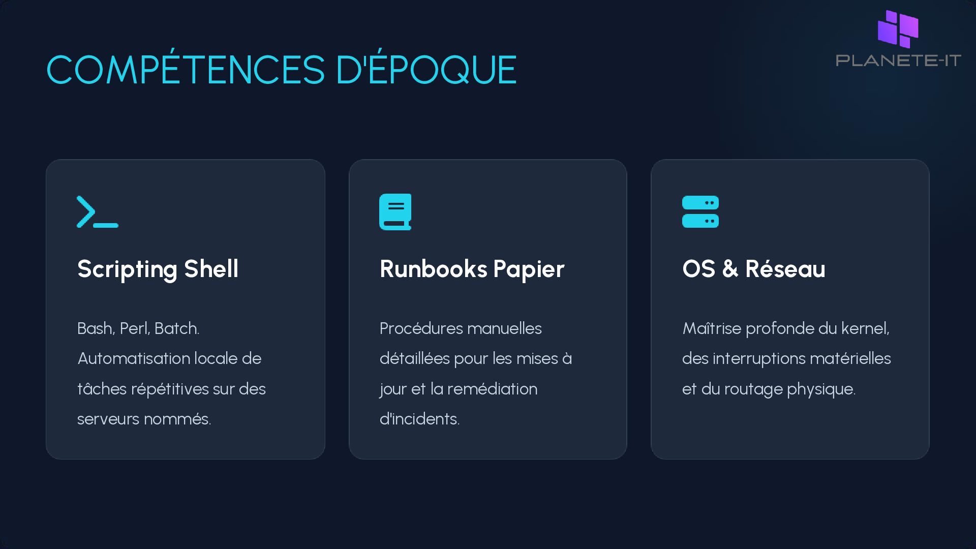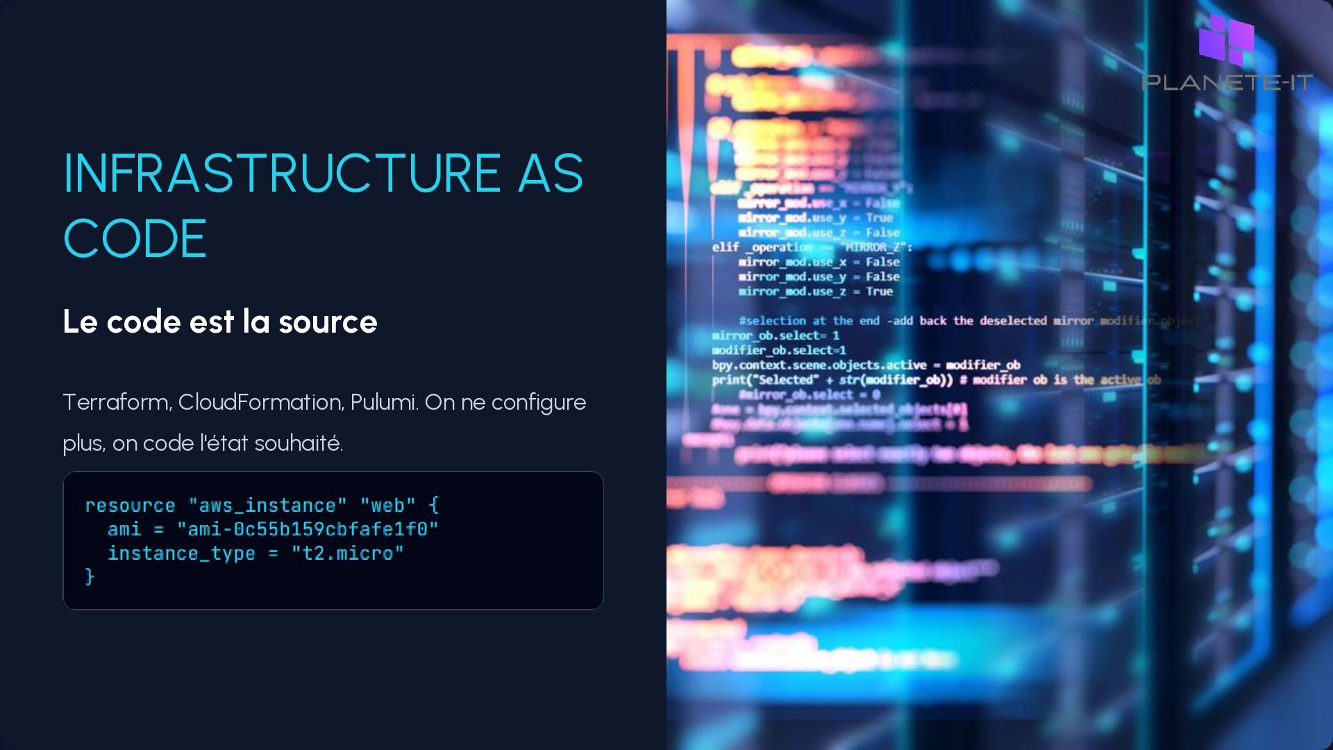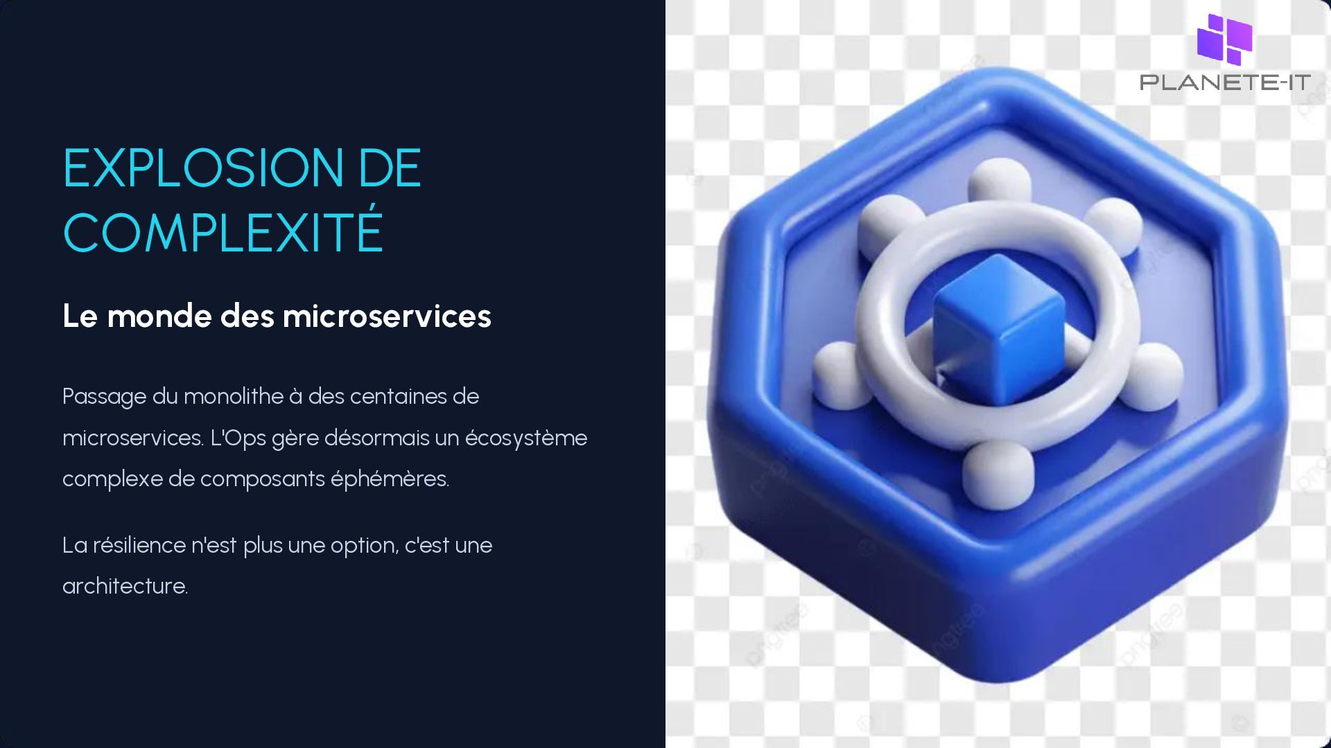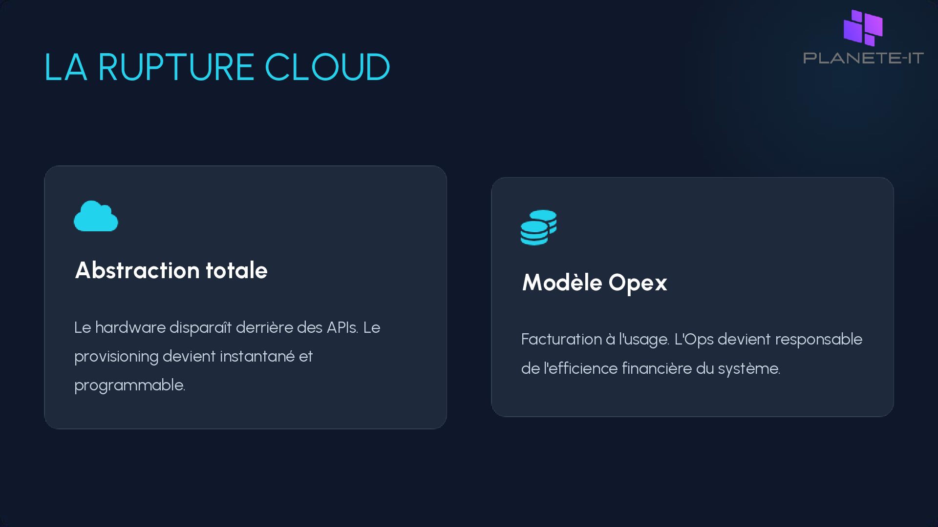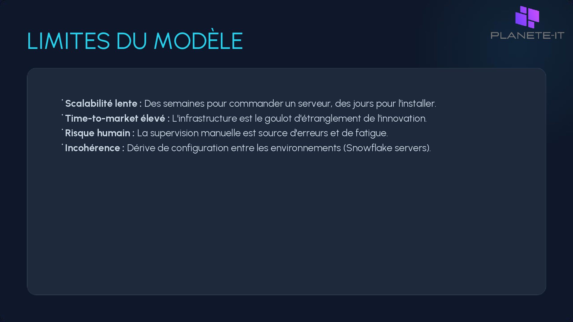 commander un serveur, des jours pour l'installer. • Time-to-market élevé : L'infrastructure est le goulot d'étranglement de l'innovation. • Risque humain : La supervision manuelle est source d'erreurs et de fatigue. • Incohérence : Dérive de configuration entre les environnements (Snowflake servers).
