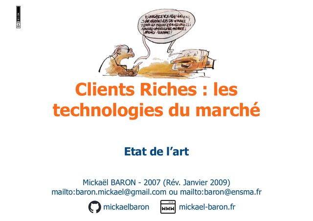 Ce support cours présente les différentes technologies du marché concernant les clients riches : définition et clarification du terme « client riche », XUL, Ajax (« à la mano » et via GWT), FLASH (Flex, AIR et Lazlo), Eclipse RCP, Eclipse RAP, .NET Framework (ClickOne.net, WPF, XAML, Silverlight), Java (Applet, Java Web Start).