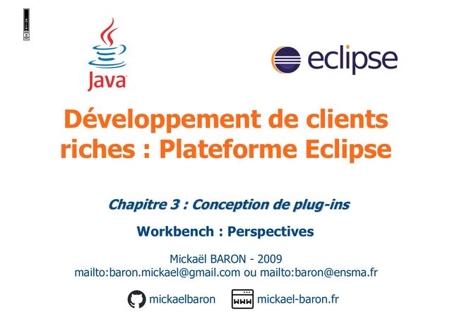 Ce support de cours s'intéresse à détailler la construction de perspectives avec la plateforme Eclipse. Les aspects suivants sont étudiés : construction déclarative, ajout de vues (view, fastview, standaloneview, placeholder, createfolder, placeholderfolder), paramétrage d'une perspective, étendre une perspective existante via Perspective Extensions, registre des perspectives, écouter les changements d'une perspective et les principales opérations du Workbench liées aux perspectives.