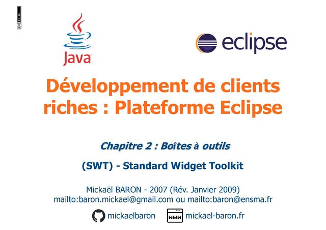 Ce support de cours s'intéresse à présenter la boîte à outils SWT : évolution des boîtes à outils pour Java, conteneurs, composants de type Control, agents de placement, gestion des événements, Graphical Context, co-habitation entre SWT et Swing, traitement synchrone et asynchrone (ThreadUI) et les boîtes de dialogue.
