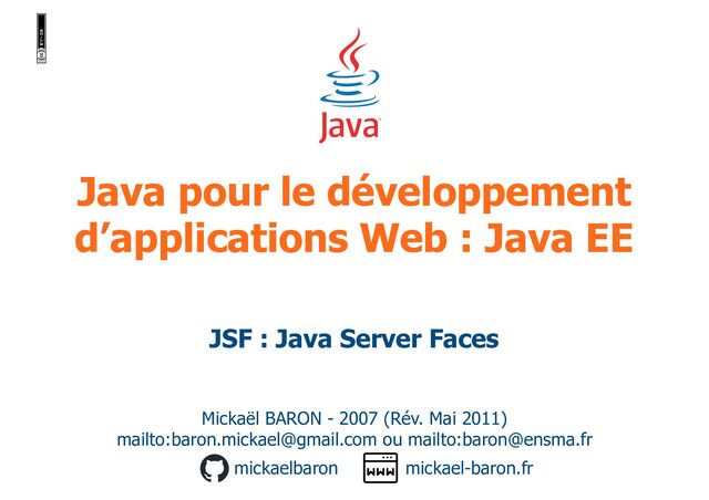 Support de cours consacré au framework JSF (version 1.2) : configuration des bibliothèques, beans managés, cycle de vie, navigation, composants CORE et HTML, FacesContext, Backing Bean, la gestion des messages, la conversion et la validation via les Converters et les Validators, la gestion des événements, les composants supplémentaires Tomahawk de la fondation Apache et enfin la création personnalisée de composants JSF.