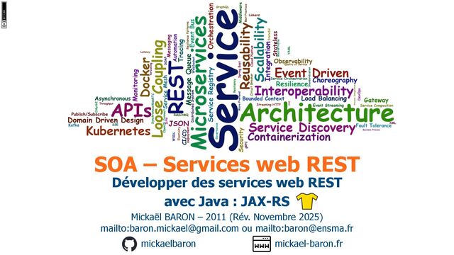 Une présentation générale de la spécification JAX-RS est donnée en première partie. Une deuxième partie s'intéresse à l'implémentation de référence JERSEY. Les parties suivantes décrivent respectivement les notions de chemin via @Path, de template parameters, de sub-resource locator, de méthodes HTTP via @GET @POST @PUT et @DELETE, de paramètres de requêtes via @PathParam @QueryParam @FormParam @HeaderParam et @Context, de représentations des données via @Consumes et @Produces, de gestion de contenu et de manipulation des réponses via la classe Response. Ensuite une partie présente l'API cliente et finalement une dernière partie termine par les problématiques de déploiement.