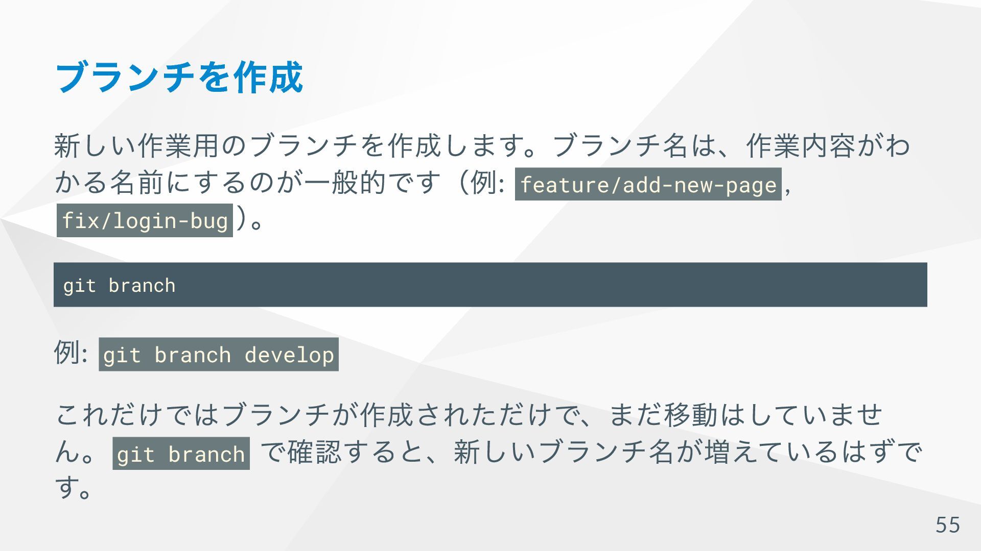 例: git branch develop これだけではブランチが作成されただけで、まだ移動はしていませ ん。 git branch で確認すると、新しいブランチ名が増えているはずで す。 55
