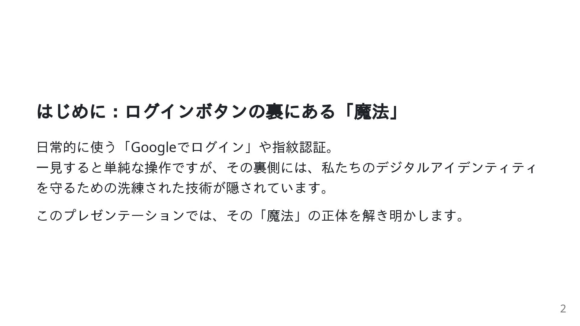 はじめに:ログインボタンの裏にある「魔法」 日常的に使う「Googleでログイン」や指紋認証。 一見すると単純な操作ですが、その裏側には、私たちのデジタルアイデンティティ を守るための洗練された技術が隠されています。 このプレゼンテーションでは、その「魔法」の正体を解き明かします。 2