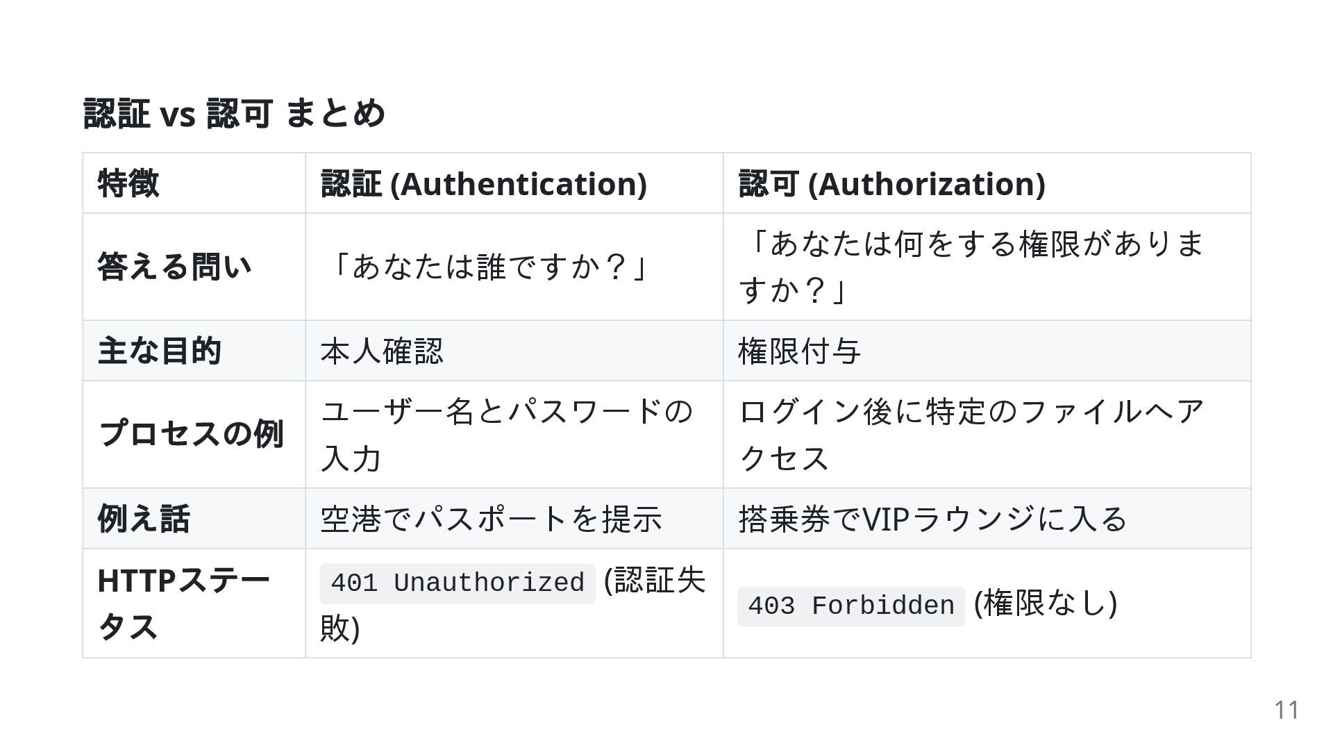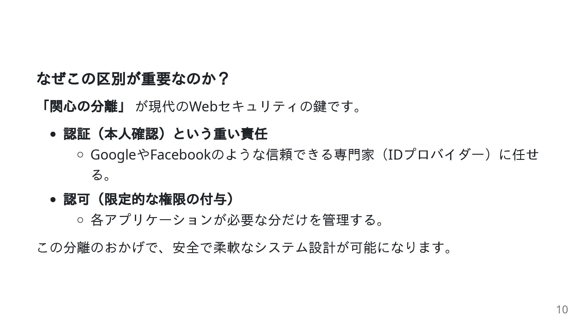 なぜこの区別が重要なのか? 「関心の分離」 が現代のWebセキュリティの鍵です。 認証(本人確認)という重い責任 GoogleやFacebookのような信頼できる専門家(IDプロバイダー)に任せ る。 認可(限定的な権限の付与) 各アプリケーションが必要な分だけを管理する。 この分離のおかげで、安全で柔軟なシステム設計が可能になります。 10