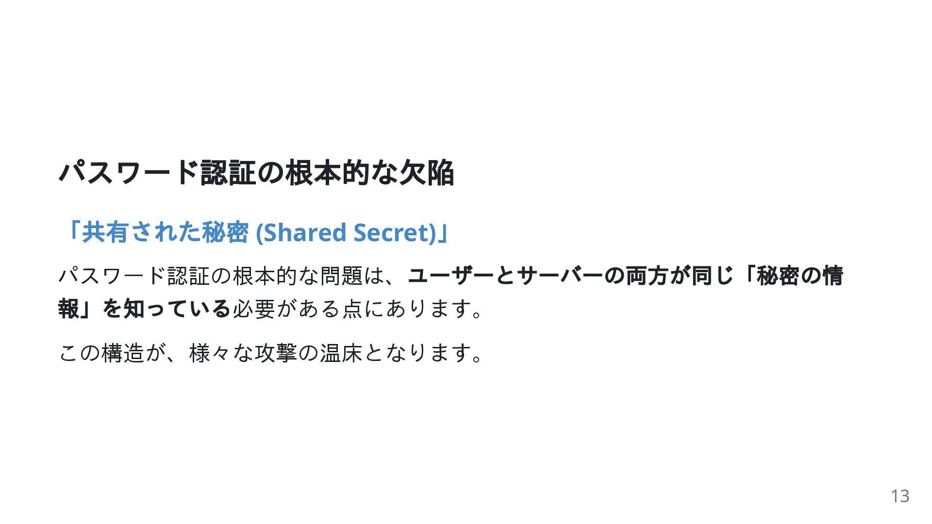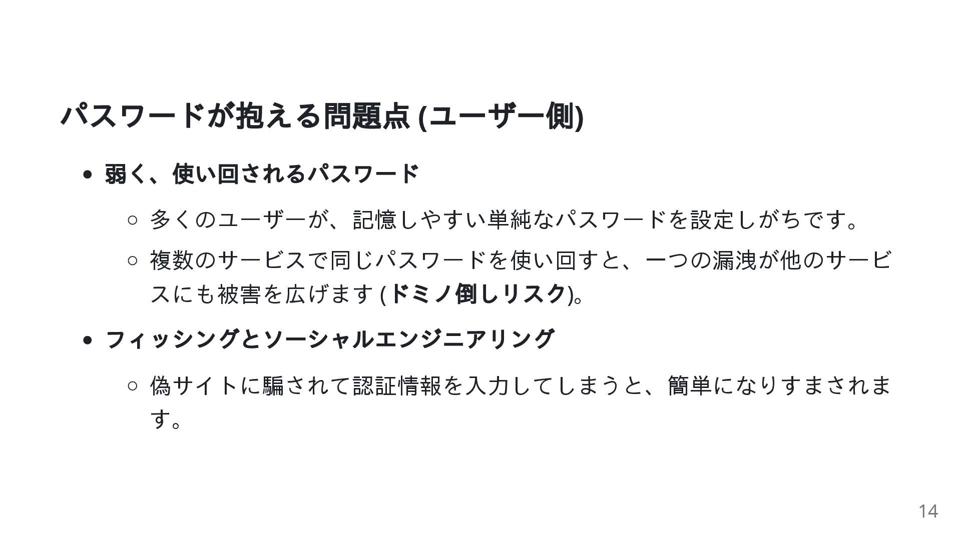 パスワード認証の根本的な欠陥 「共有された秘密 (Shared Secret) 」 パスワード認証の根本的な問題は、 ユーザーとサーバーの両方が同じ「秘密の情 報」を知っている必要がある点にあります。 この構造が、様々な攻撃の温床となります。 13