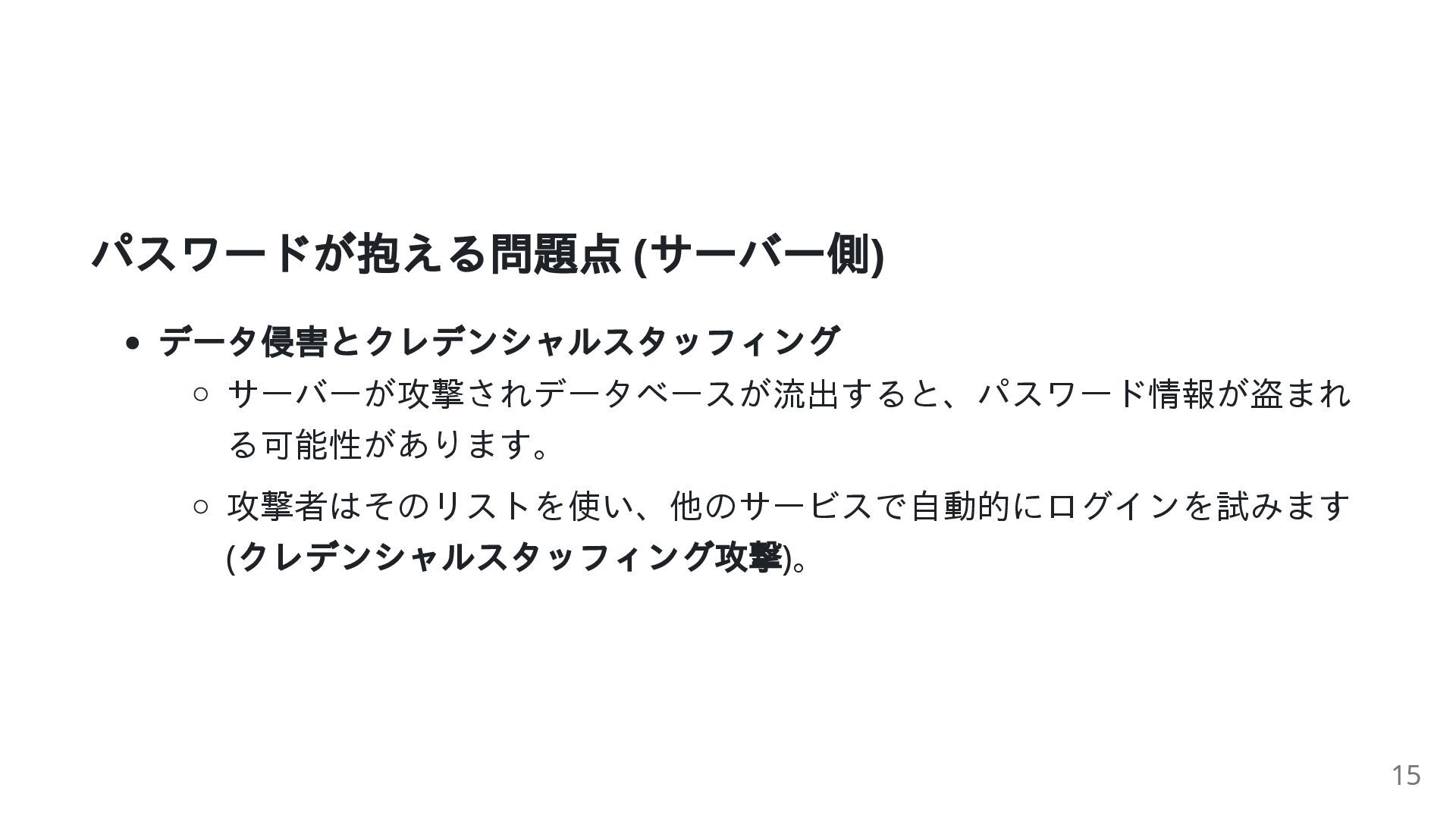 パスワードが抱える問題点 ( サーバー側) データ侵害とクレデンシャルスタッフィング サーバーが攻撃されデータベースが流出すると、パスワード情報が盗まれ る可能性があります。 攻撃者はそのリストを使い、他のサービスで自動的にログインを試みます ( クレデンシャルスタッフィング攻撃)。 15