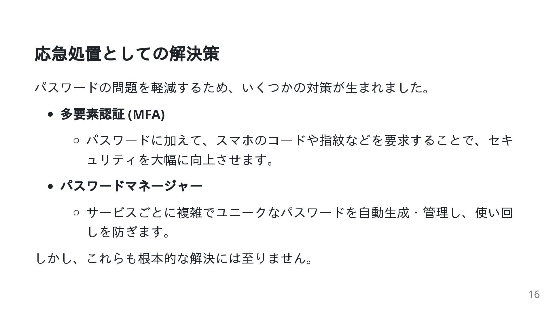 応急処置としての解決策 パスワードの問題を軽減するため、いくつかの対策が生まれました。 多要素認証 (MFA) パスワードに加えて、スマホのコードや指紋などを要求することで、セキ ュリティを大幅に向上させます。 パスワードマネージャー サービスごとに複雑でユニークなパスワードを自動生成・管理し、使い回 しを防ぎます。 しかし、これらも根本的な解決には至りません。