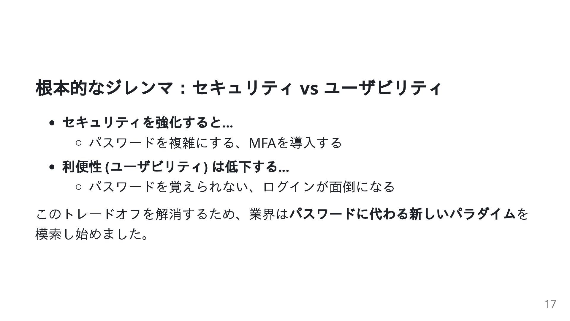 根本的なジレンマ:セキュリティ vs ユーザビリティ セキュリティを強化すると... パスワードを複雑にする、MFAを導入する 利便性 ( ユーザビリティ) は低下する... パスワードを覚えられない、ログインが面倒になる