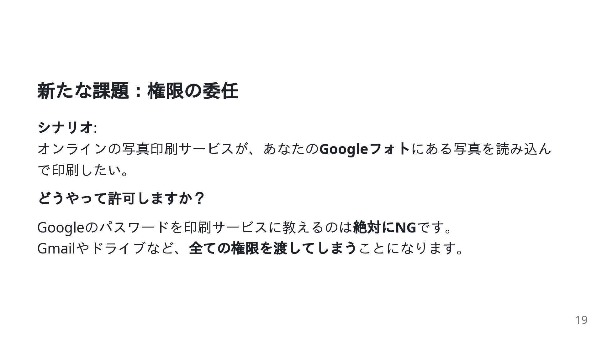 新たな課題:権限の委任 シナリオ: オンラインの写真印刷サービスが、あなたのGoogle フォトにある写真を読み込ん で印刷したい。 どうやって許可しますか? Googleのパスワードを印刷サービスに教えるのは 絶対にNGです。 Gmailやドライブなど、 全ての権限を渡してしまうことになります。
