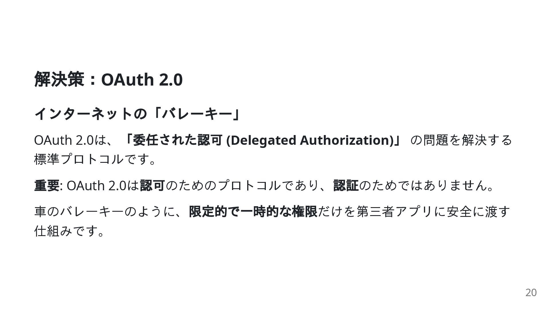 標準プロトコルです。 重要: OAuth 2.0は 認可のためのプロトコルであり、 認証のためではありません。 車のバレーキーのように、 限定的で一時的な権限だけを第三者アプリに安全に渡す 仕組みです。 20