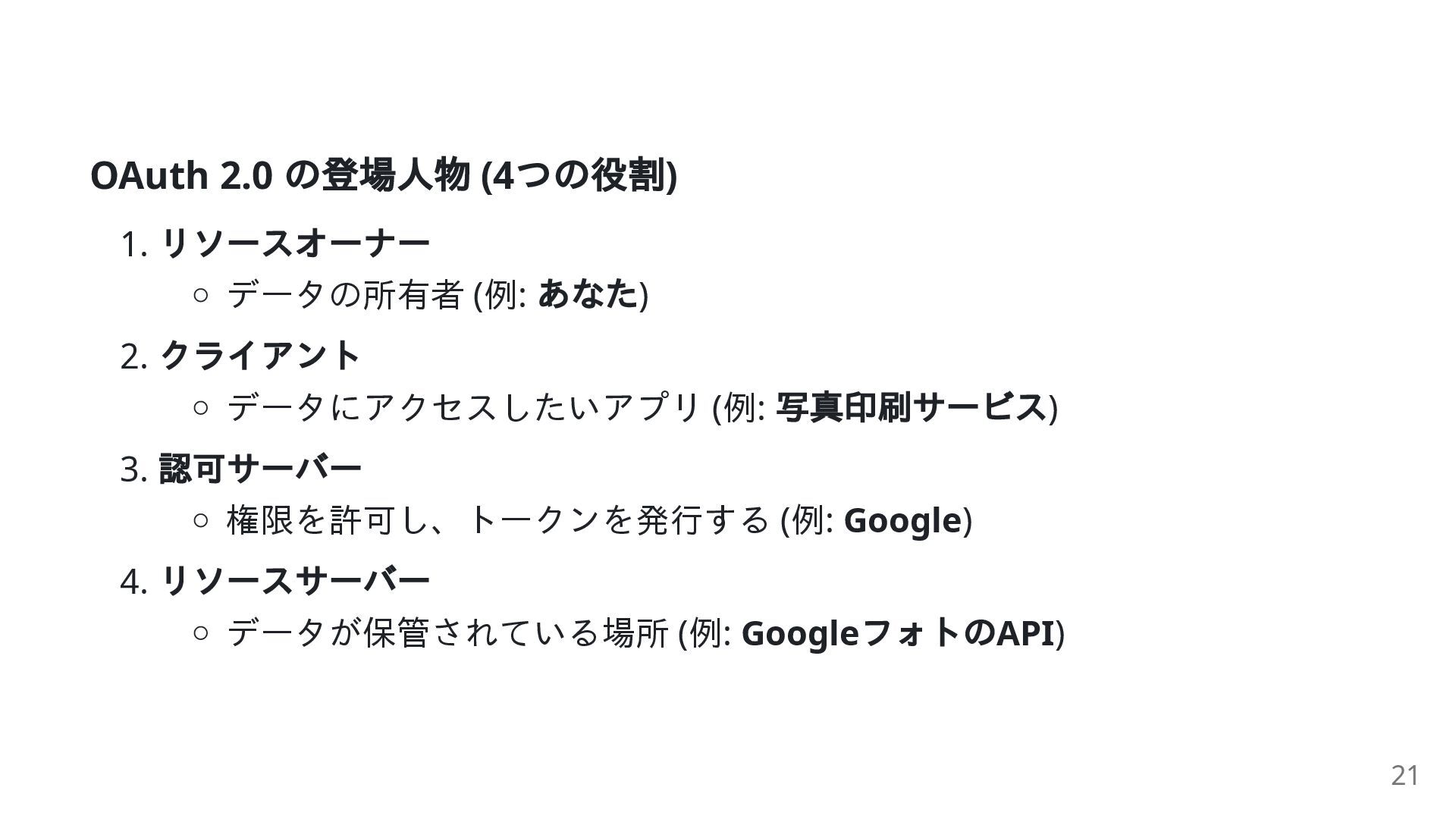 2. クライアント データにアクセスしたいアプリ (例: 写真印刷サービス) 3. 認可サーバー 権限を許可し、トークンを発行する (例: Google) 4. リソースサーバー データが保管されている場所 (例: Google フォトのAPI) 21
