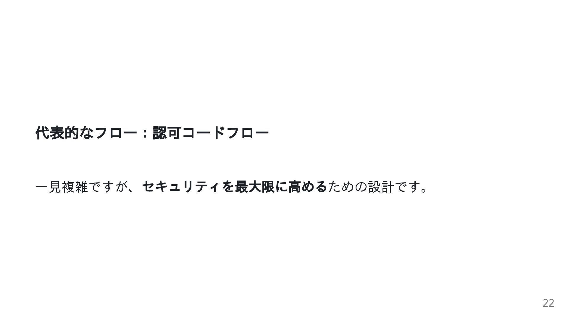 代表的なフロー:認可コードフロー 一見複雑ですが、 セキュリティを最大限に高めるための設計です。 22