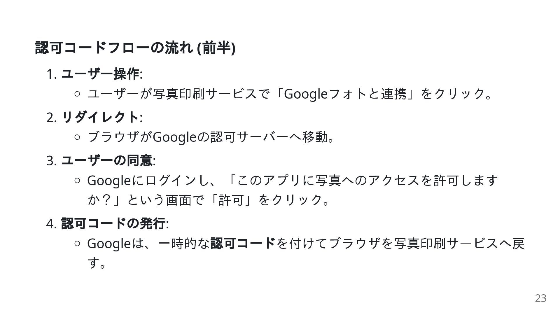 ユーザーの同意: Googleにログインし、「このアプリに写真へのアクセスを許可します か?」という画面で「許可」をクリック。 4. 認可コードの発行: Googleは、一時的な 認可コードを付けてブラウザを写真印刷サービスへ戻 す。 23