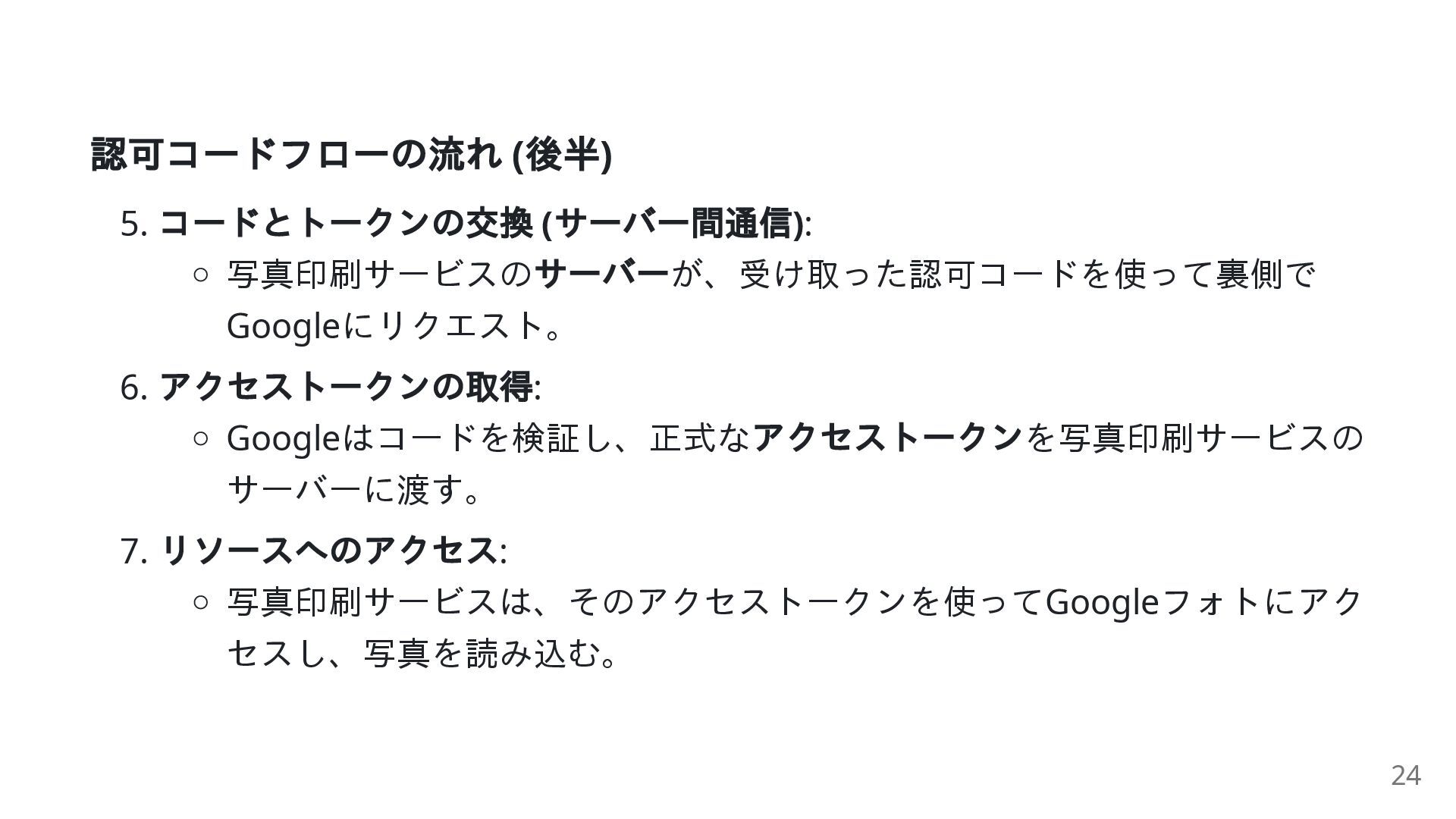 6. アクセストークンの取得: Googleはコードを検証し、正式な アクセストークンを写真印刷サービスの サーバーに渡す。 7. リソースへのアクセス: 写真印刷サービスは、そのアクセストークンを使ってGoogleフォトにアク セスし、写真を読み込む。 24