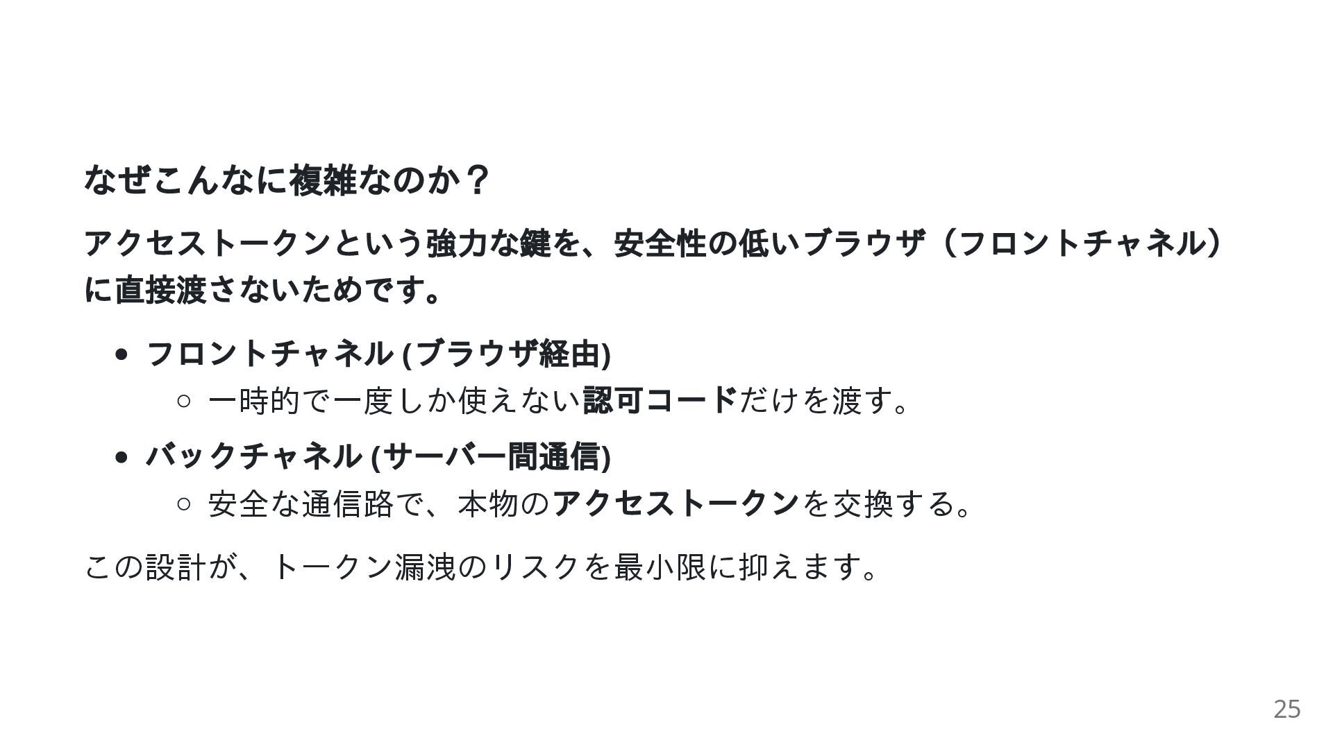 なぜこんなに複雑なのか? アクセストークンという強力な鍵を、安全性の低いブラウザ(フロントチャネル) に直接渡さないためです。 フロントチャネル ( ブラウザ経由) 一時的で一度しか使えない 認可コードだけを渡す。 バックチャネル (