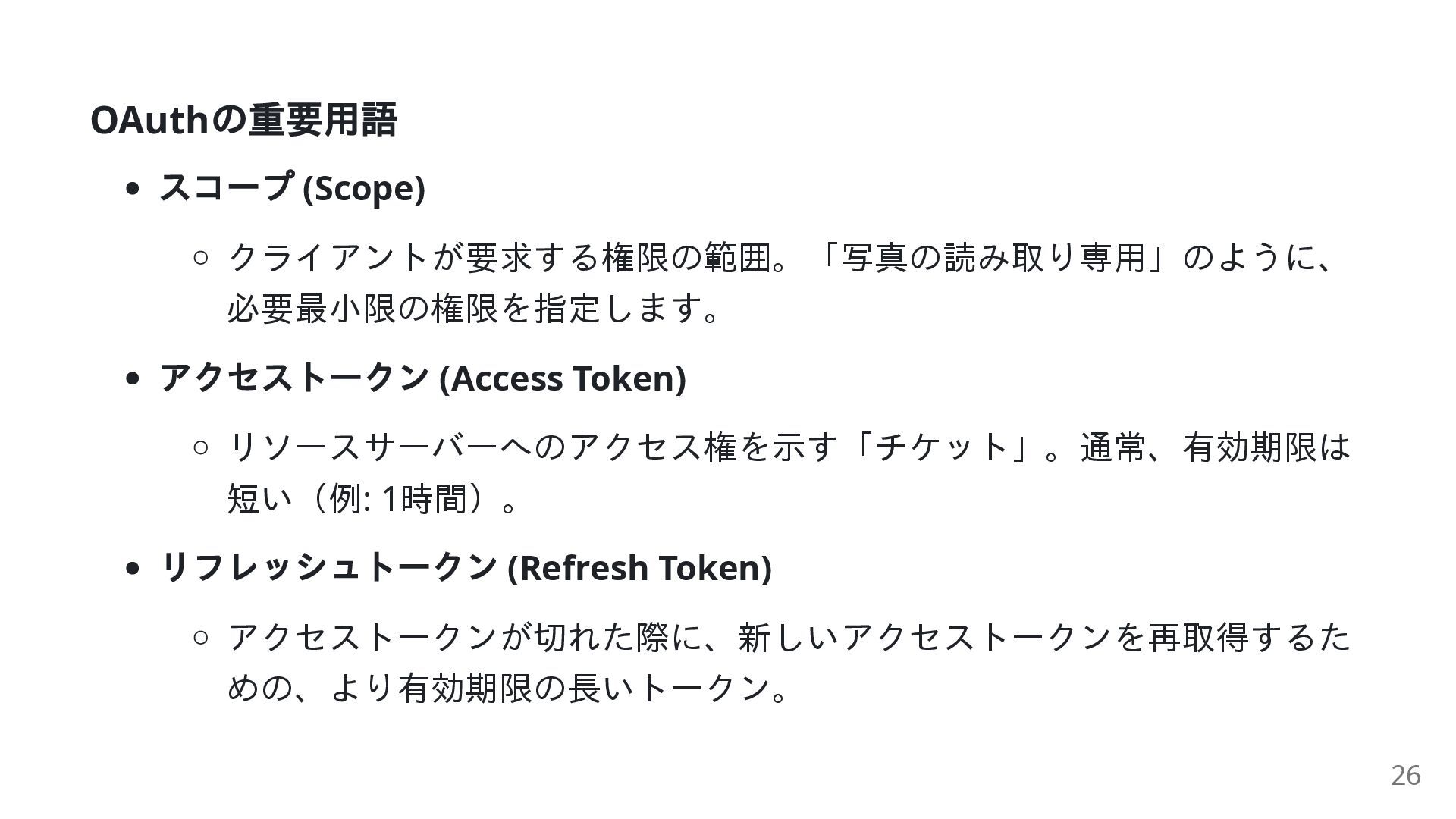 OAuth の重要用語 スコープ (Scope) クライアントが要求する権限の範囲。「写真の読み取り専用」のように、 必要最小限の権限を指定します。 アクセストークン (Access Token) リソースサーバーへのアクセス権を示す「チケット」。通常、有効期限は