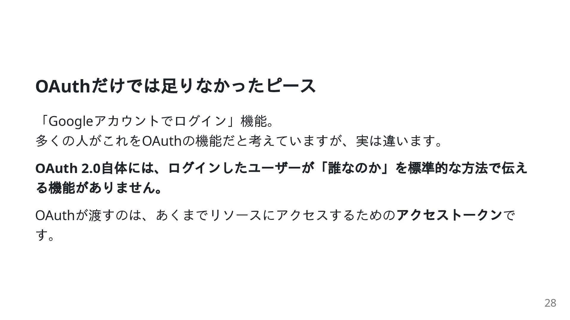 OAuth だけでは足りなかったピース 「Googleアカウントでログイン」機能。 多くの人がこれをOAuthの機能だと考えていますが、実は違います。 OAuth 2.0 自体には、ログインしたユーザーが「誰なのか」を標準的な方法で伝え る機能がありません。 OAuthが渡すのは、あくまでリソースにアクセスするための アクセストークンで