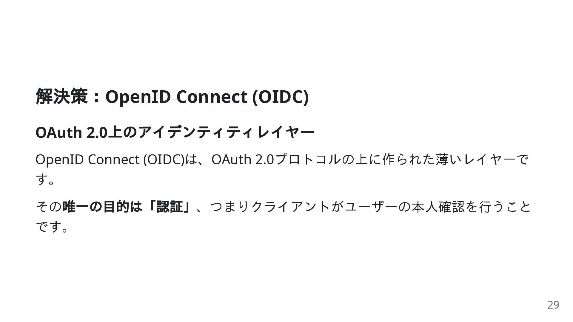 す。 その 唯一の目的は「認証」、つまりクライアントがユーザーの本人確認を行うこと です。 29