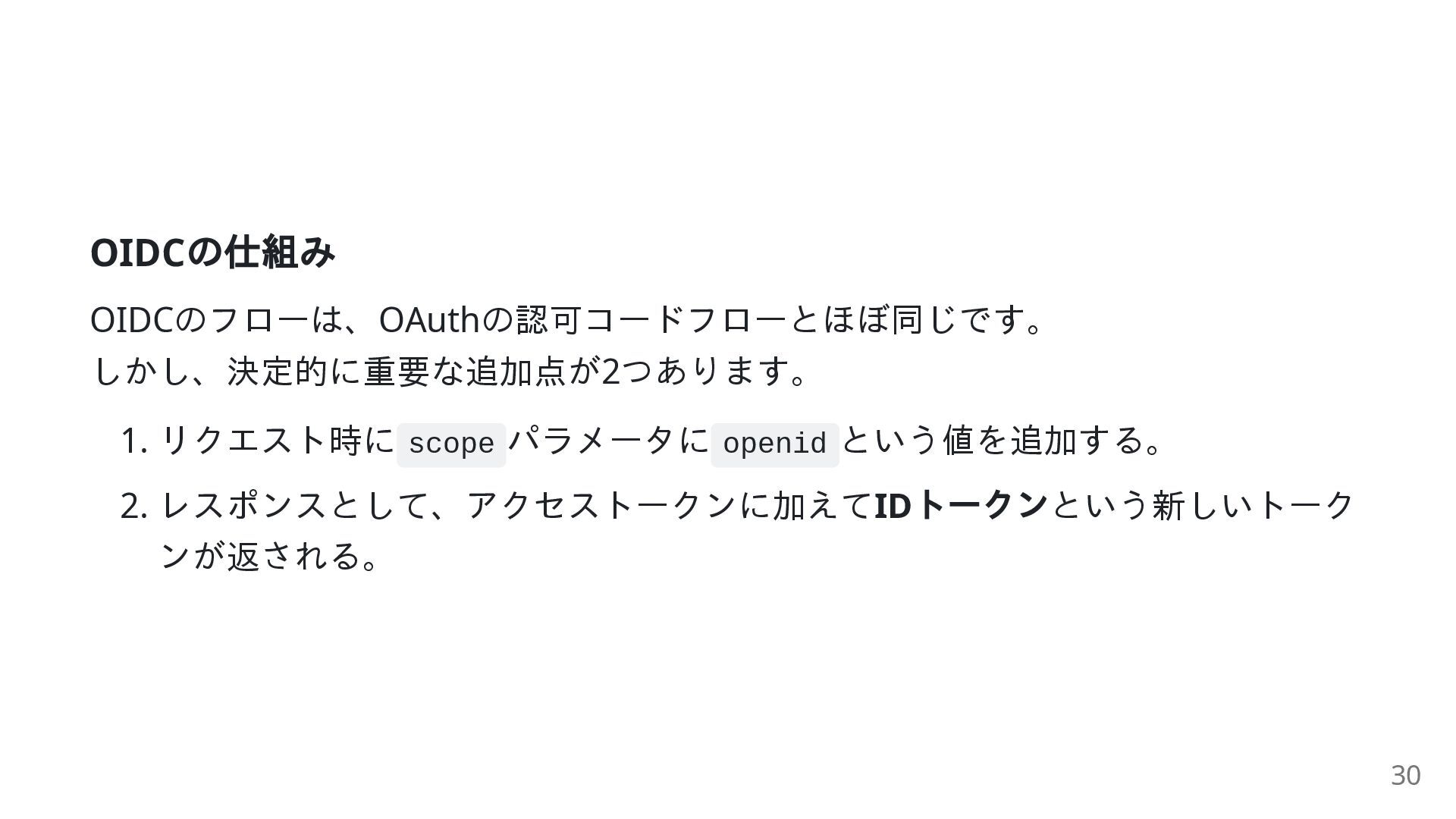 OIDC の仕組み OIDCのフローは、OAuthの認可コードフローとほぼ同じです。 しかし、決定的に重要な追加点が2つあります。 1. リクエスト時に scope パラメータに openid という値を追加する。