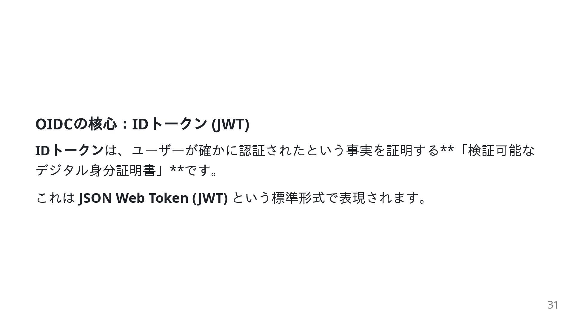 OIDC の核心:ID トークン (JWT) ID トークンは、ユーザーが確かに認証されたという事実を証明する**「検証可能な デジタル身分証明書」**です。 これは JSON Web